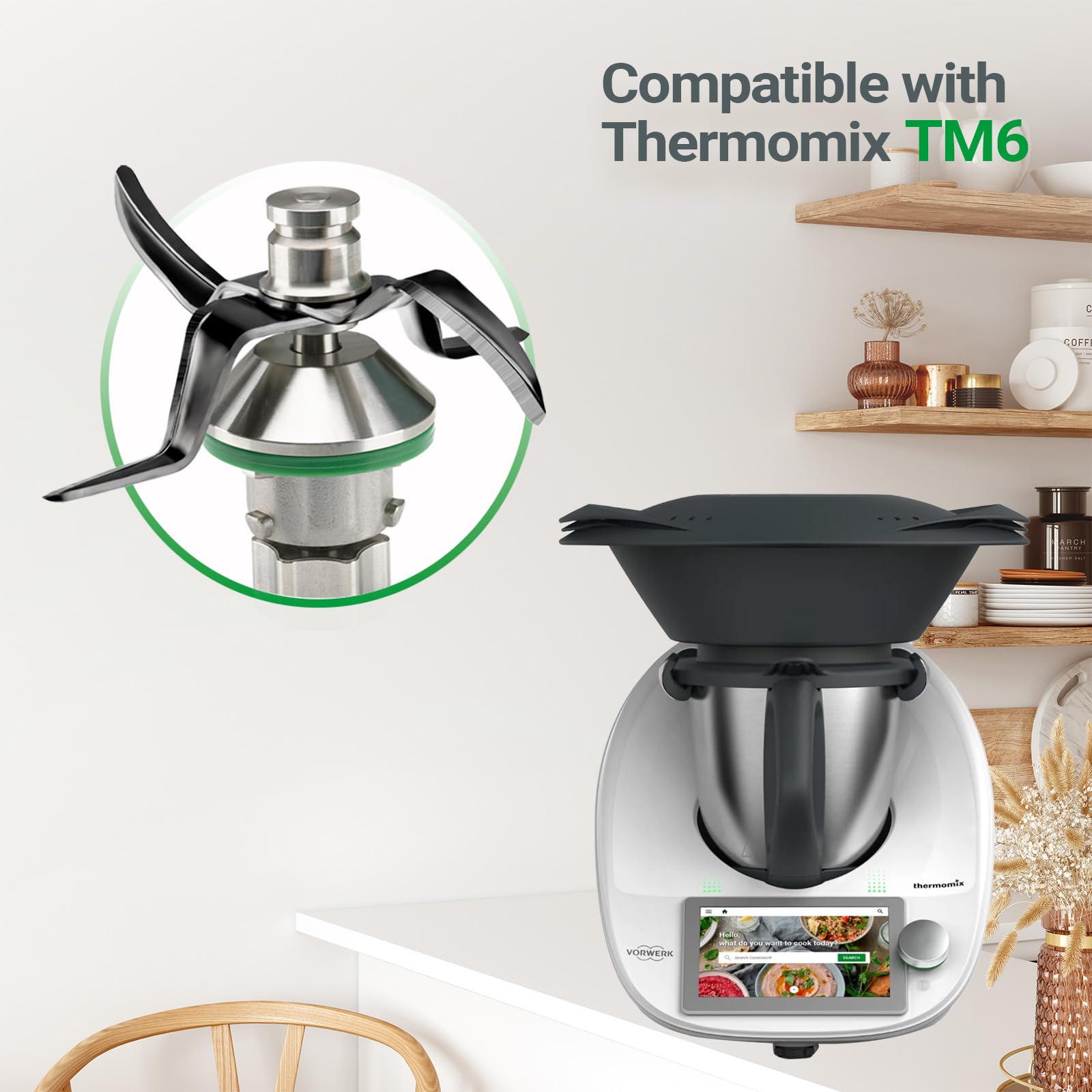 ["High-performance bearings increase durability","Titanium coating enhances hardness and abrasion resistance","Non-stick coated surface, easy to clean","Compatible with Vorwerk Thermomix TM6 kitchen machine","Includes: 1 * Titanium-coated sharpened knife"]