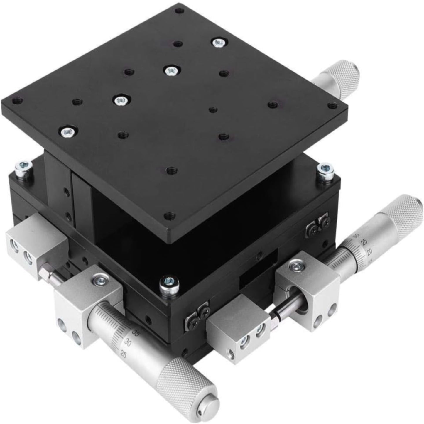 ["ADJUSTABLE XYZ-3 AXIS"]: The manual linear stage features adjustable XYZ-3 axis degrees of freedom, allowing for precise adjustment and positioning. The internal cross roller ensures high precision and strong load capacity.["INCREASED DURABILITY"]: Nickel-plated locking screws and fine adjustment knobs provide durability and corrosion resistance. The carbide side head ensures a firmer lock, even in complex environments, making it more durable and rust-resistant.["STRONG LOAD CAPACITY"]: The fine adjustment slide table is equipped with high-strength cross guide rails made of bearing steel, ensuring strong load capacity, stable operation, and better wear resistance.["CORROSION AND RUST RESISTANT"]: The surface of the guide rail is galvanized coated, making it corrosion and rust resistant. It can be used in complex environments without compromising its performance.["VERSATILE APPLICATIONS"]: Suitable for various applications such as production machines, testing equipment, optical experimental measurements, and more. Easily achieve precise movements and positioning.