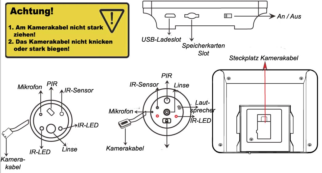 Wireless: The entire set does not require any cables. Only the camera is connected to the monitor through the door hole. The monitor is equipped with a 5000mAh battery that lasts up to 6 months. The monitor can be charged via the USB port with the included 3m USB cable. The image transmission for motion/PIR/motion detection goes directly to your phone through the SmartLife app or optionally Tuya. An alarm signal can be set in the app as a push notification. When someone is within 3m of the door, you will automatically receive a message on your phone.