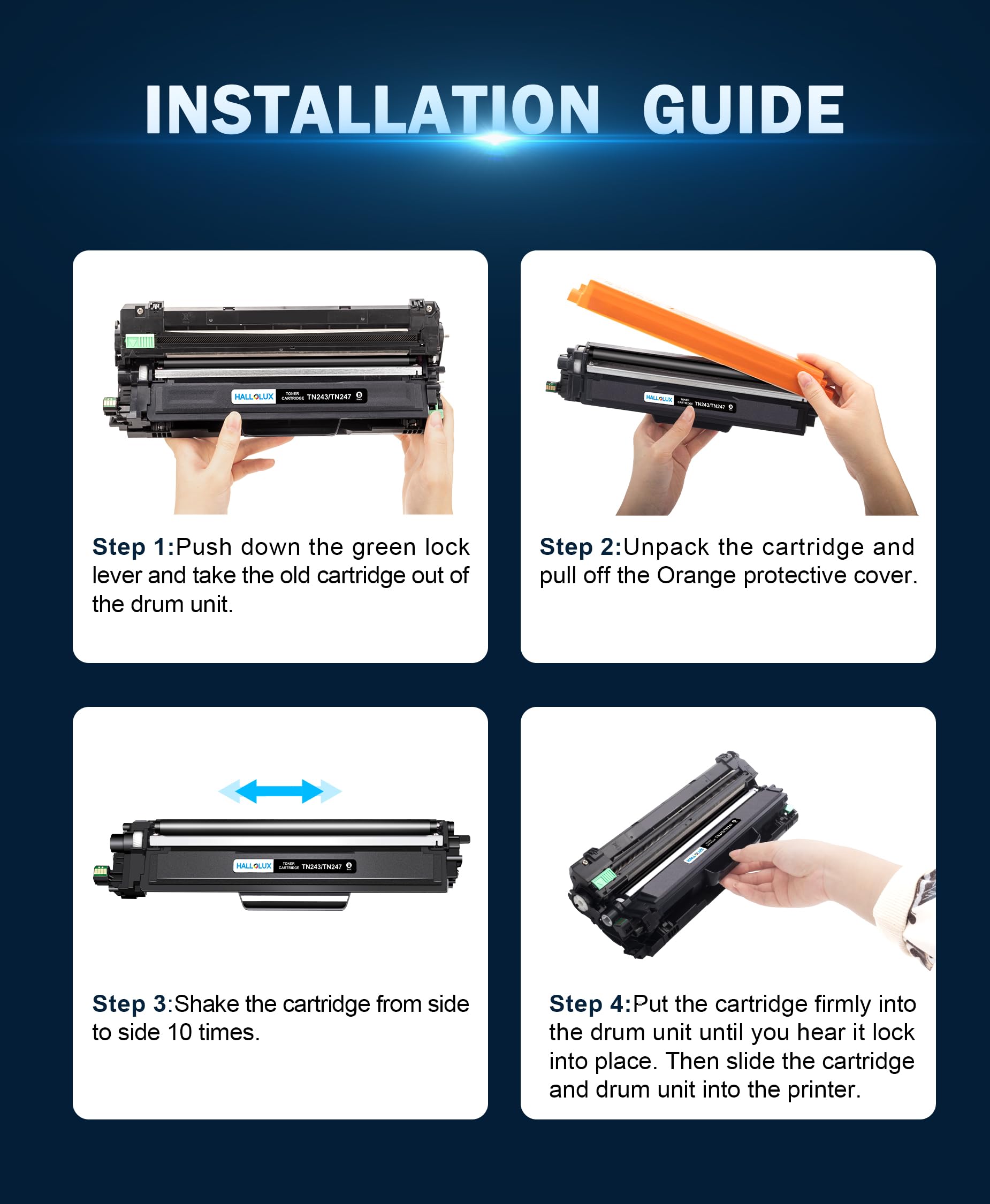 ["HALLOLUX TN-247 TN-243 TN247 TN243 Toner Cartridge Compatible for Brother TN-243CMYK TN-247C TN-247M TN-247Y TN-243BK TN-243C TN-243M TN-243Y (Not original)", "High page yield: 3000 pages per TN-247BK TN247BK Black cartridge; 2300 pages per TN247 TN-243CMYK color cartridge (at 5% coverage)", "Compatible for Brother MFC-L3750CDW MFC-L3770CDW MFC-L3710CW MFC-L3730CDN DCP-L3550CDW DCP-L3510CDW DCP-L3517CDW HL-L3210CW HL-L3230CDW HL-L3270CDW", "Product advantages: HALLOLUX TN-243CMYK Toner Value Pack Compatible for Toner Brother MFC L3750CDW Produce with Brilliant Sharp Black Print Effects (New and old packaging will be randomly shipped, product quality is the same)", "HALLOLUX TN247 TN-243CMYK Provides Brother DCP-L3550CDW Toner for an Exquisite Printing Effect. It is an Ideal Choice for Your Daily Use (The product is protected by Amazon Transparency and you can verify the authenticity of each item)"]