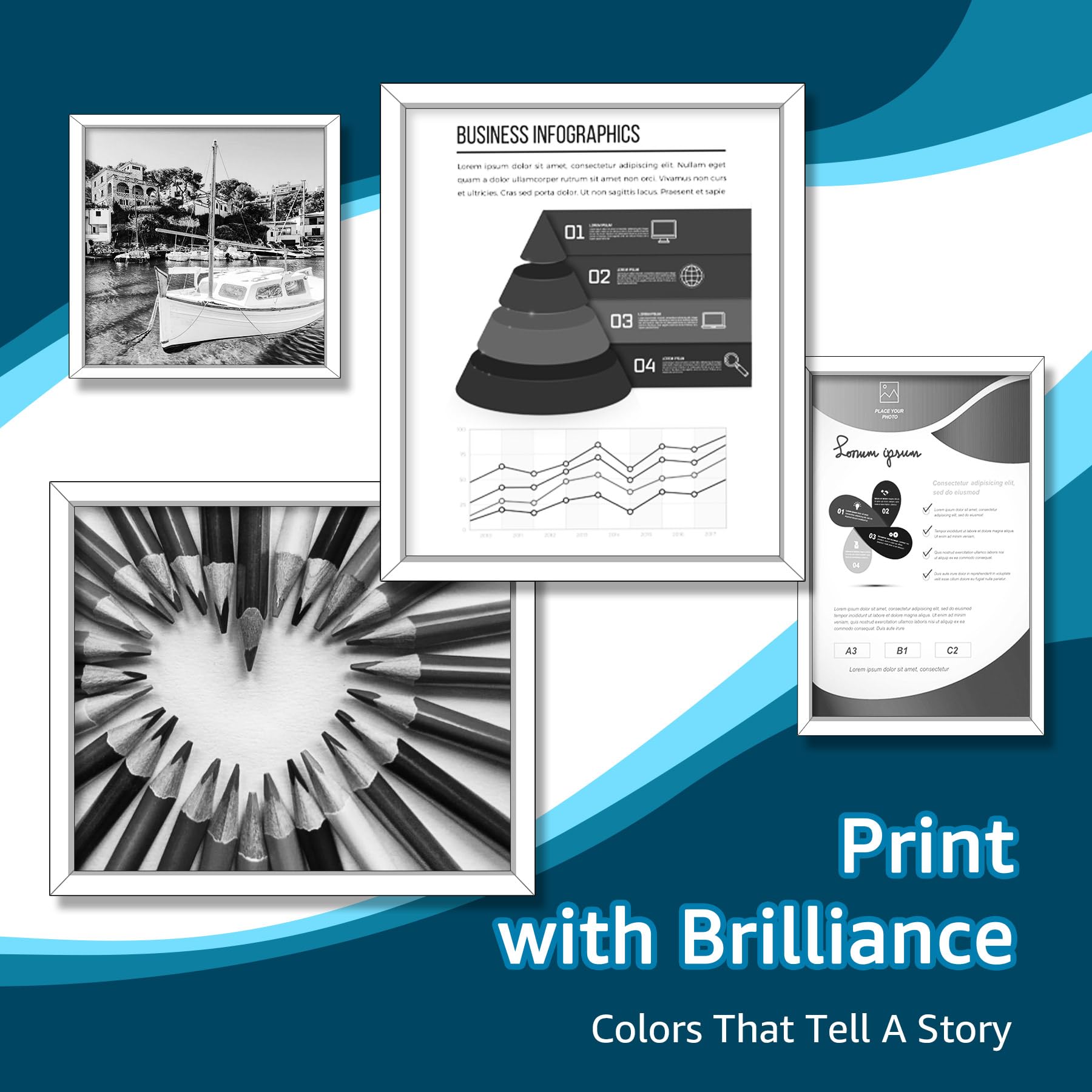 "High resolution printing: Equipped with the latest upgraded chips to ensure high compatibility. Premium inks deliver crisp texts and graphics."