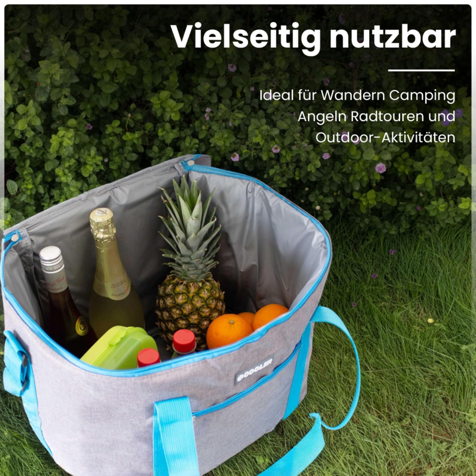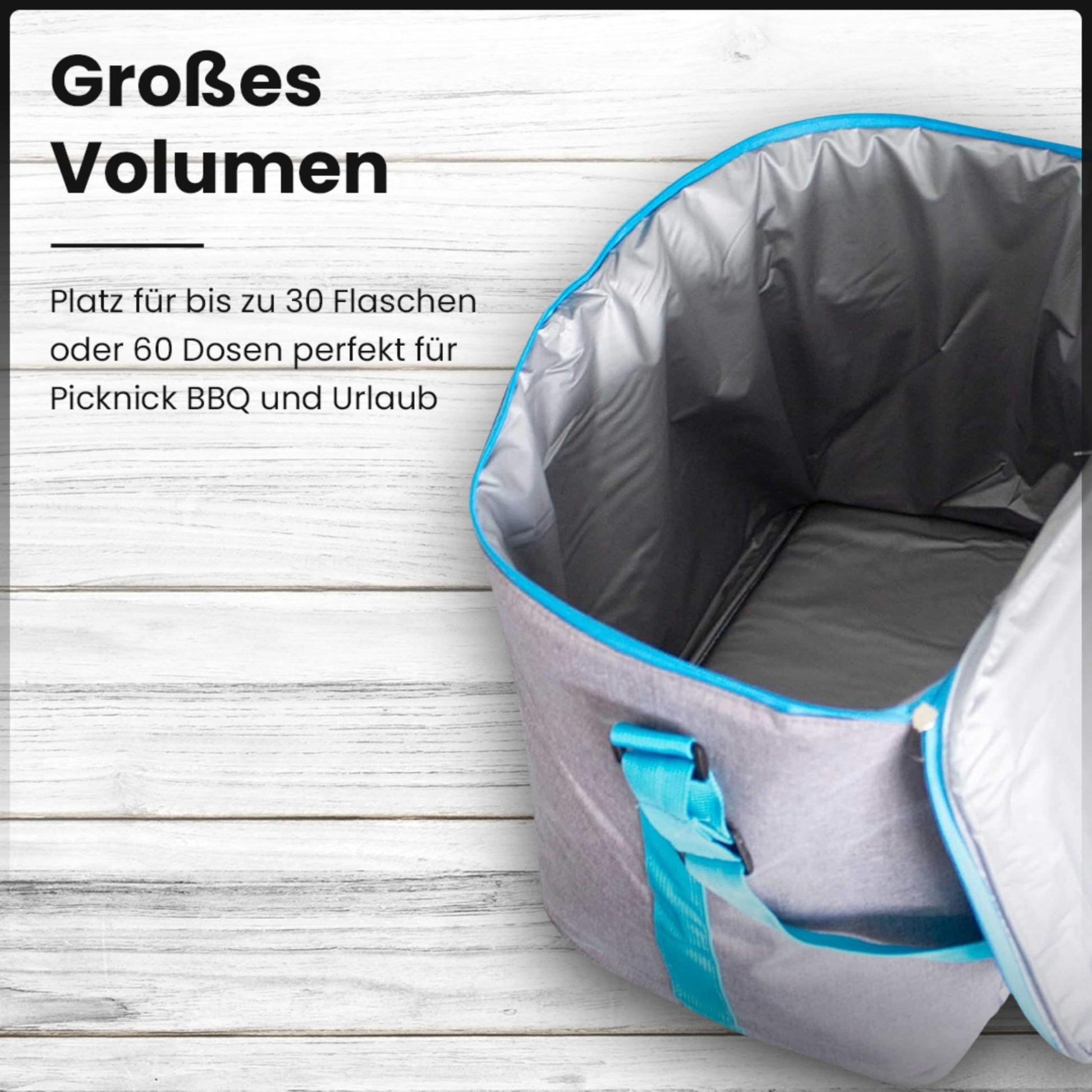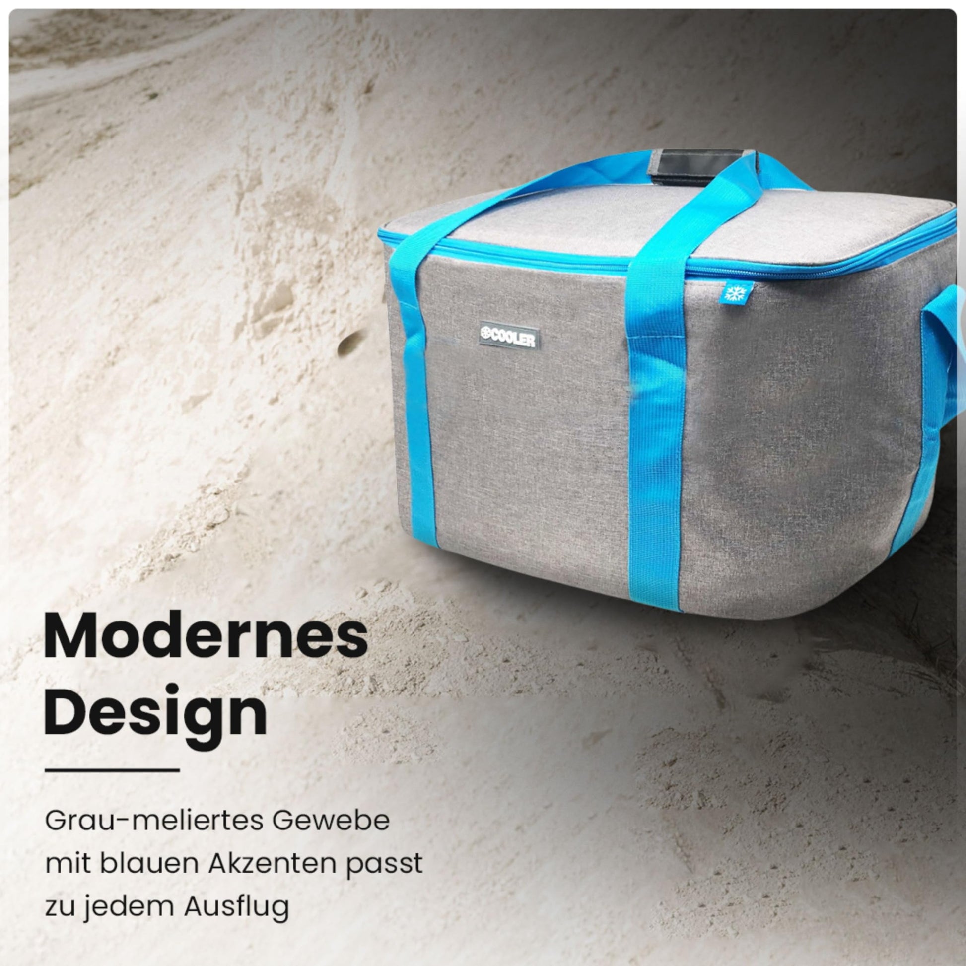 ["HIGH-QUALITY INSULATION: The ToCi cooler bag is made of heat-insulating material and is made of waterproof fabric","36 LITERS CAPACITY: The large capacity of the bag allows for the transportation of up to 30 bottles or 60 cans. Ideal for camping, vacation, outing, or BBQ","MULTIFUNCTIONAL: Ideal for an outdoor picnic or transporting food for school, work, picnic, or grilling","STYLISH: The attractive design makes the multifunctional lunch bag a practical companion in everyday life, camping, or traveling","PACKAGE INCLUDES: 1 x ToCi cooler bag, W x H x D (in inches): 17 x 13 x 12, grey-melange with blue accents"]