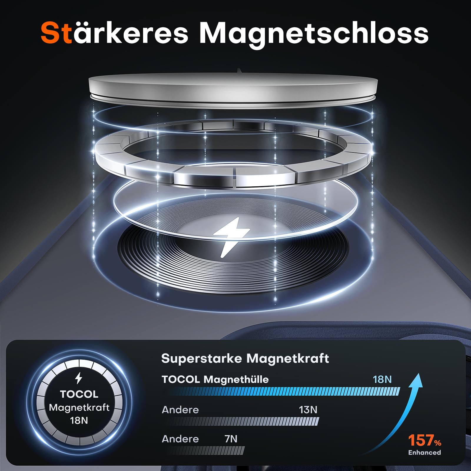 TOCOL iPhone 16 Pro case for Magsafe, with full camera protection, shockproof and scratch-resistant. Transparent back with magnetic closure in blue color.