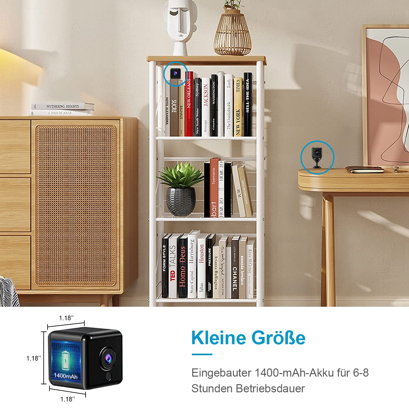 [Built-in high-performance battery for 6-8 hours of use]: The built-in 1400mAh battery stores energy without losing it, allowing for 6-8 hours of continuous operation on a full charge. The mini WiFi camera comes with a sturdy USB plug cable that allows for continuous recording while being charged. This way, you won't have to worry about what's going on at home while on the go, and you'll never miss an important moment again!