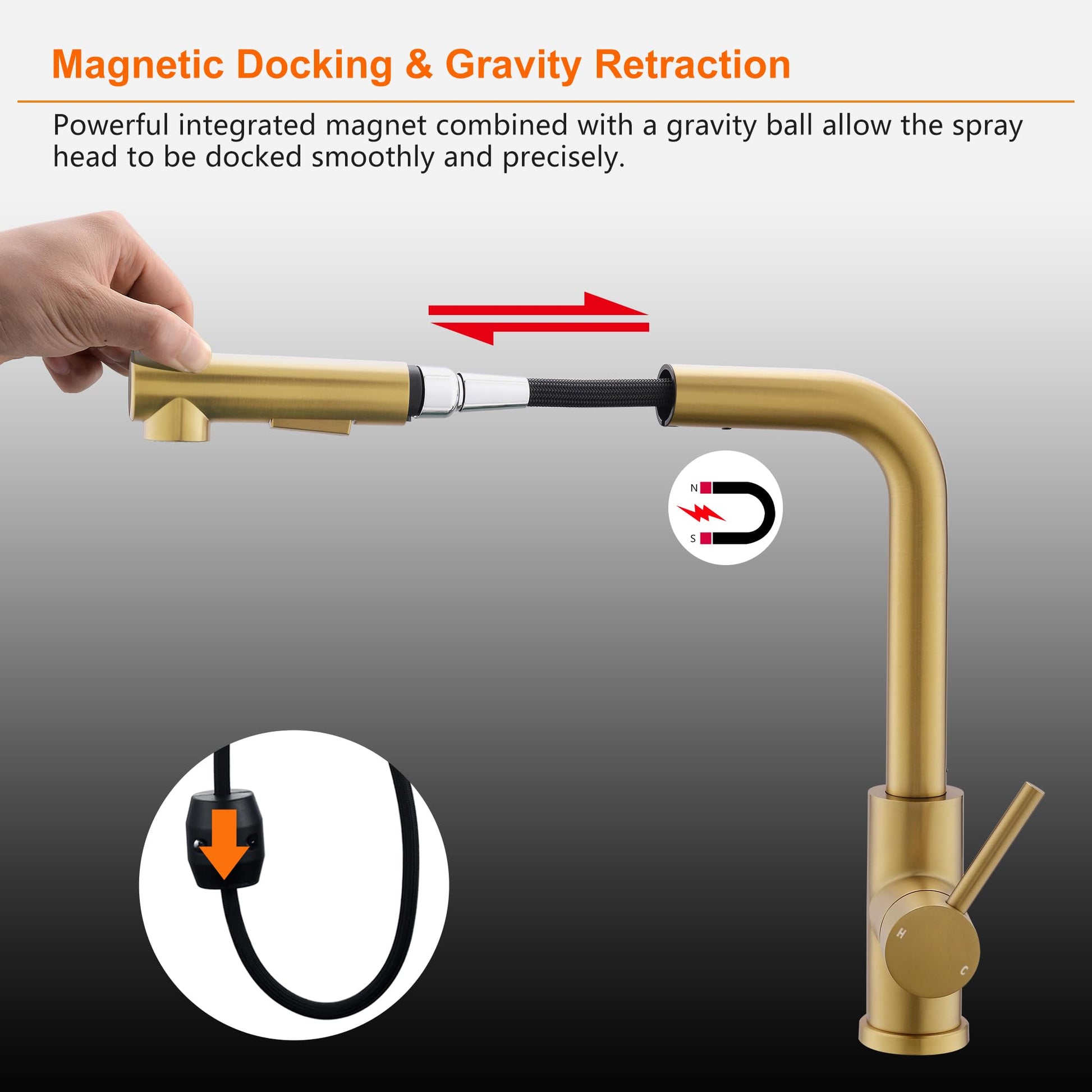 【Magnet Docking-Prevent Dropping】This brushed gold matte kitchen faucet features a strong built-in magnet that holds the spray head in place. When not in use, the spray head stays docked and will not droop over time.