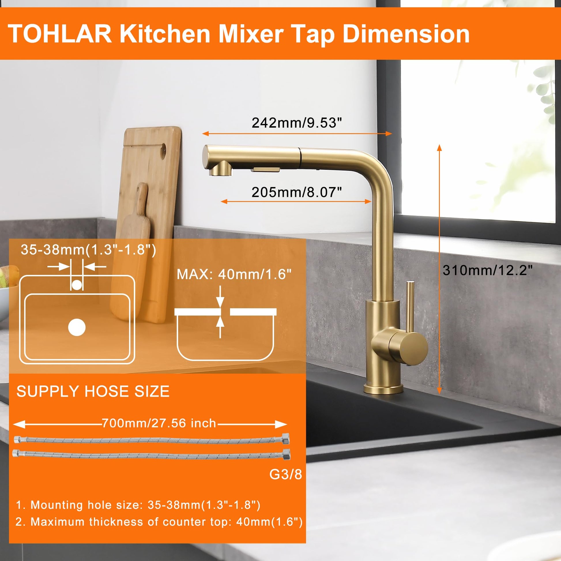 【Easy Installation】Tohlar stainless steel kitchen mixer with Germany standard connections require no additional hardware and can be easily installed with just a few simple steps.