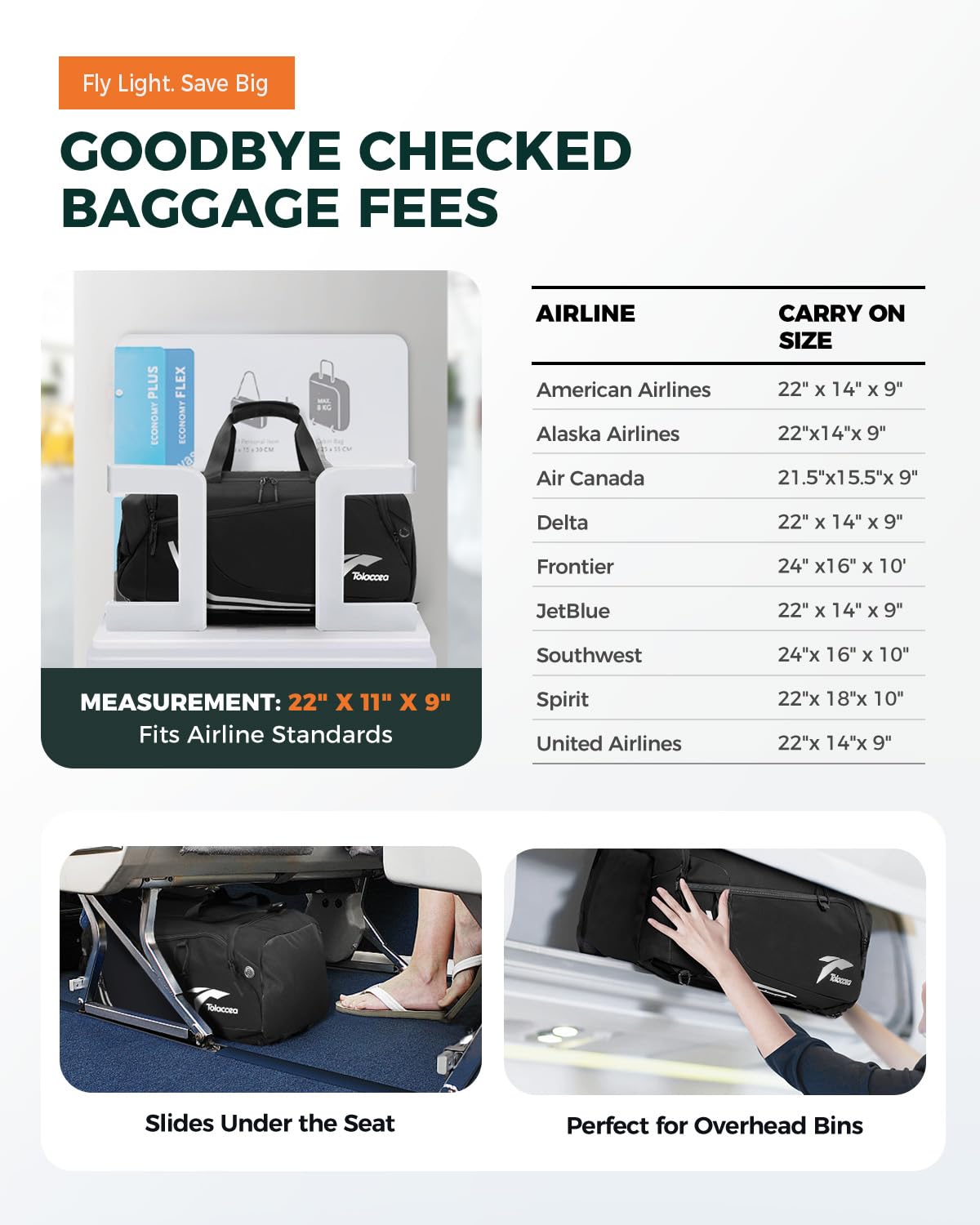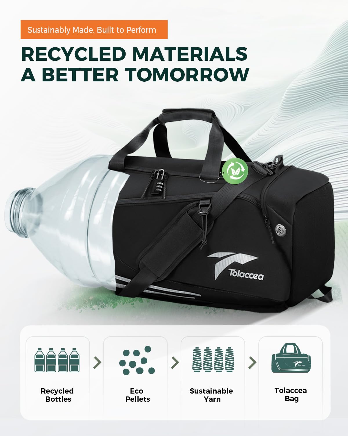 ["【ALL INCLUDED AND WELL ORGANIZED】Thanks to its well-thought-out design, the 45L sports backpack offers plenty of space for all your essentials. (Dimensions: 60 x 25 x 30 cm / 1.25 kg) The main compartment is spacious and features various pockets. Socks, shoes, t-shirt, shorts - this stylish Tolaccea sports bag for men has room for everything you need for your workout.","【3-IN-1 DESIGN SPORTS BAG】Tolaccea sports bag for men offers three carrying options: shoulder bag, handbag, and backpack. On the back of the training bag, there are hidden shoulder straps and padded and adjustable double shoulder straps, making it more comfortable and stable when riding and walking. The convenient handle and adjustable independent shoulder straps also make it easier to carry the luggage on top daily, convenient for travel and business trips.","【BACKPACK WITH SEPARATE SHOE COMPARTMENT and WET POCKET】The separate shoe compartment is equipped with 2 air holes to keep the sports backpack clean and ventilated. Separate waterproof wet pocket: store clothes or swim gear after the workout without getting the rest of your stuff wet.","【SUSTAINABLE AND DURABLE】The durable material mix of the Tolaccea 45L sports bag consists of recycled polyamide and polyester made from recycled PET bottles. The coated surface is dirt and water repellent, and has a better eco-balance than newly produced materials. Combined with the carbon alloy zippers, every corner of this bag is durable, from the zipper tips to the seams, and should withstand years of wear and tear.","【MULTIPURPOSE HAND CARRIED BAG】This Tolaccea bag combines functionality, comfort, and a sporty design that is suitable for both men and women. Can be used daily as a travel bag, football bag, sauna bag, and swim bag. Perfect for anyone seeking flexibility and comfort on the go."]