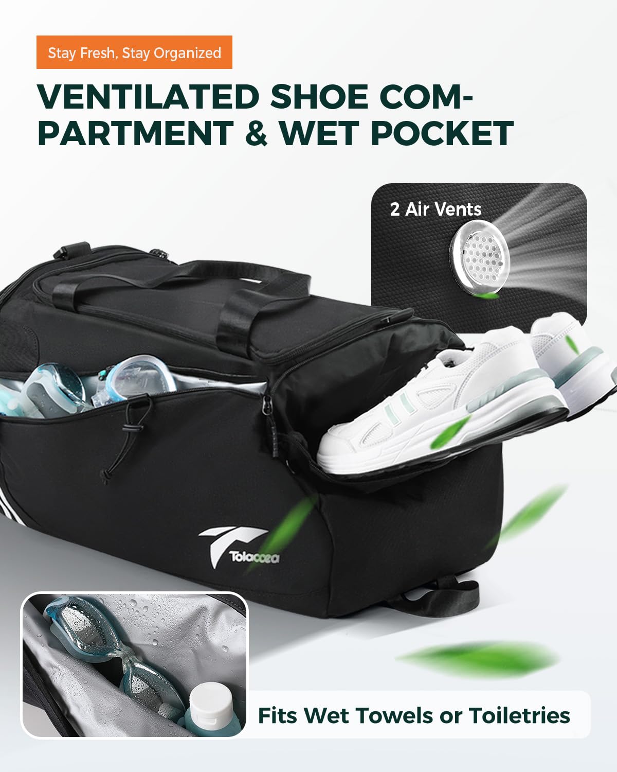 Tolaccea sports bag for men with backpack function, large 45L sports backpack with shoe compartment and wet compartment, women's duffel bag for gym, sauna, soccer, swimming, and gym (black).