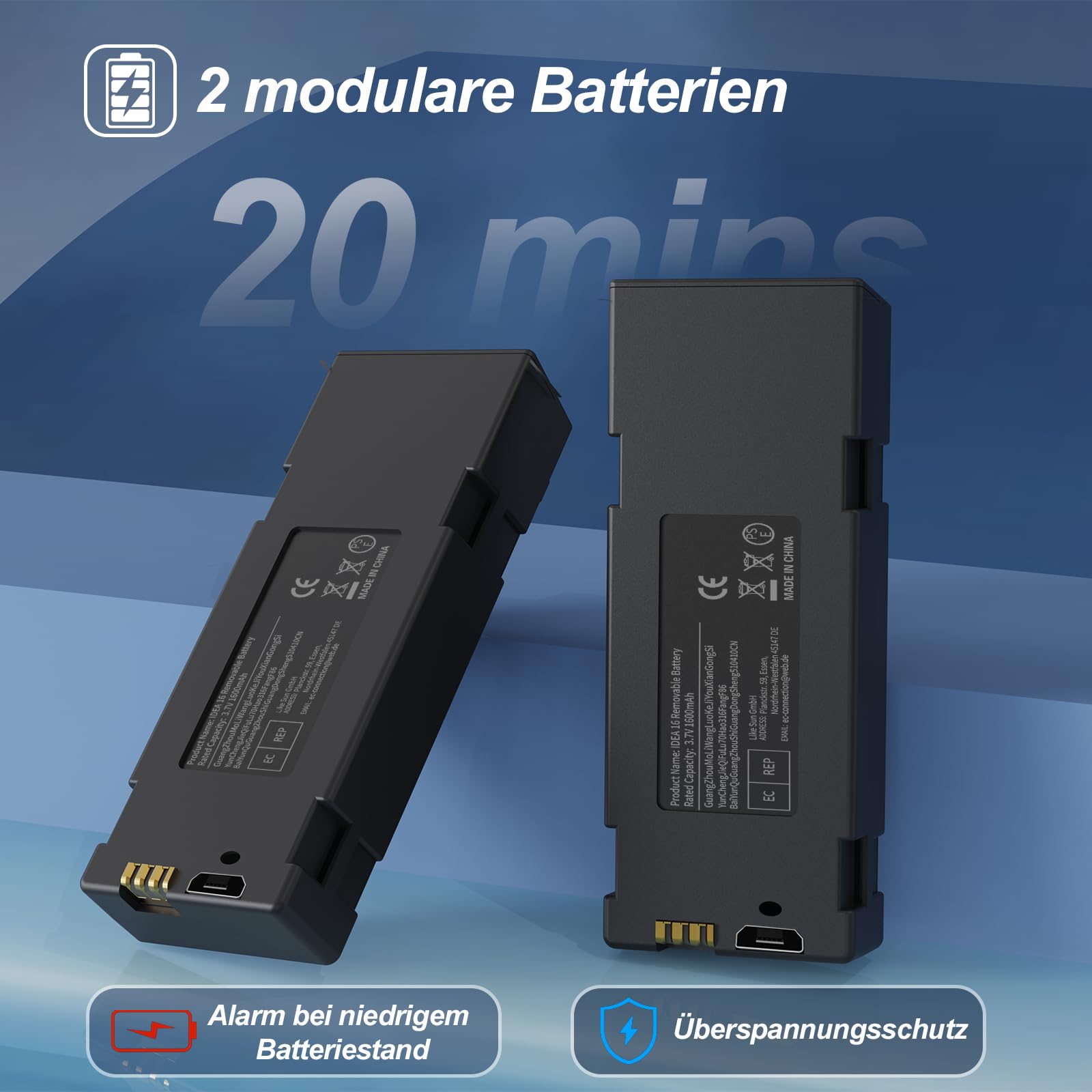 "🔋【2 Modular Batteries】Toladrone TD12 kids drone comes with 2 x 3.7V 1200mAh modular batteries to enjoy a longer flight experience. This allows you more time to capture amazing aerial shots and explore new perspectives. Each battery lasts approximately 10 minutes, resulting in a total flight time of 20 minutes with both batteries. Please note that battery flight time may be reduced in cold temperatures and with frequent use of drone functions.",