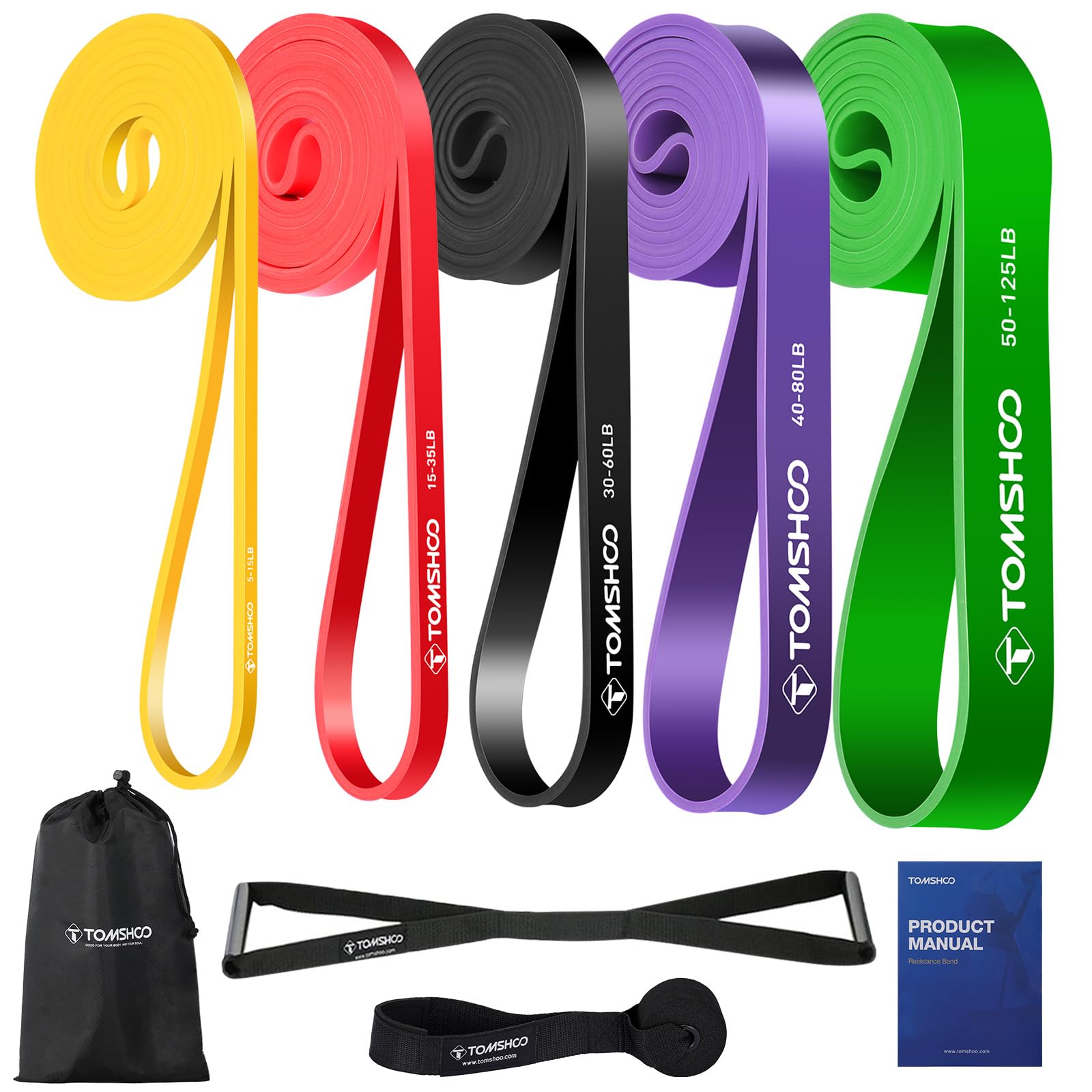 ["5 bands with different colors, each clearly marked with the weight range for various tensions: Yellow 5-15 lbs, Red 15-35 lbs, Black 30-60 lbs, Purple 40-80 lbs, Green 50-125 lbs. Use a single band or combine multiple bands for different resistance levels.",