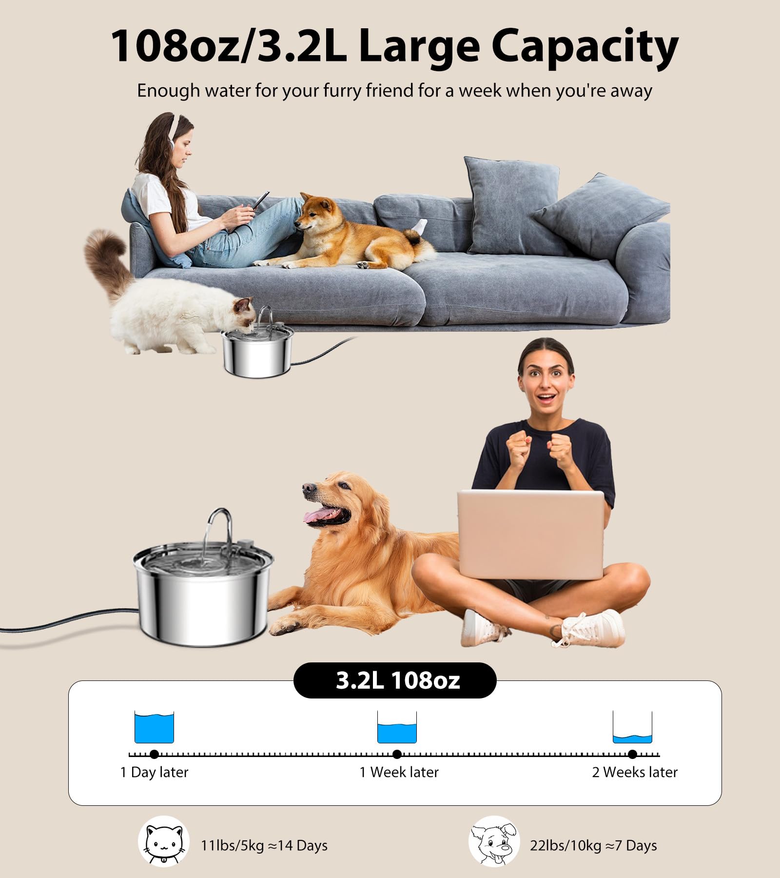 "➤ WHY CHOOSE STAINLESS STEEL? ➤ - Stainless steel is a great material for cat fountains, it is high temperature resistant, corrosion resistant, oxidation resistant, and durable. The plastic fountain, however, cannot be sterilized at high temperatures. Bacteria that grow during use can make the fountain smell bad and even cause infections on the cat's chin. The TOMXCUTE cat fountain is made of food-grade stainless steel, which is safer for pets","➤ CREATIVE INSPIRATION ➤ - We have seen cats drinking from the dripping faucet in the bathroom or kitchen sink. Cats like running water, which can arouse their curiosity and lead them to drink more water. This cat fountain combines the design concept of a "faucet". Perfect for some cats who like to drink under the faucet. The water circulation process increases oxygen in the water and keeps it fresh","➤ EFFICIENT FILTER SYSTEM ➤ - The cat water dispenser is equipped with a charcoal filter and a sponge. The activated charcoal filter is made of cotton, coconut activated carbon, and ion exchange resin, effectively filtering out hair and allowing cats to drink fresher water. The sponge protects the pump, isolates impurities, and extends the pump's lifespan","➤ UPGRADED PUMP ➤ - The pump of this cat water dispenser uses the latest improved motor technology, low power consumption operation, and is super quiet, even when placed in the bedroom, it will not affect your sleep. The 5V/1.5W pump runs 24/7 to entice your cat and dog to drink more water. The motor is easy to disassemble and can be thoroughly cleaned every two weeks","➤ DISHWASHER SAFE ➤ - The stainless steel housing and gray plastic of this cat fountain can be placed in the dishwasher for cleaning and disinfection. The pump and its holder are not suitable for dishwashers. The pump has a 6-month warranty. If the cat fountain stops working, replacing the water pump can solve the problem. Any questions, feel free to contact the seller","➤ WE ARE ALWAYS HERE ➤ - TOMXCUTE's mission is to "enable a better life for pets". Our love for pets makes us a united team and our extensive experience in pet care makes us professional in our products. Look for "TOMXCUTE Filter" and "TOMXCUTE Water Pump" to find replacement parts."