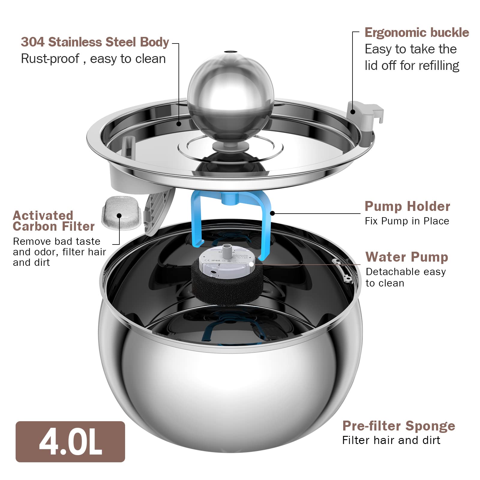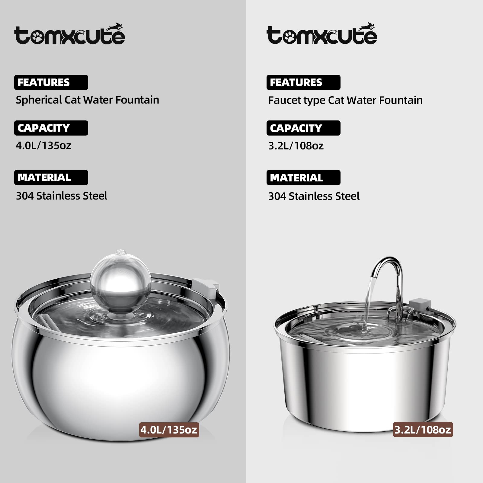 ["【4L Large Capacity】The capacity of the water fountain is 4.0L, so you don't have to refill it frequently, making it suitable for small and medium-sized pets. The dog water dispenser is marked with a high and low water level line and can last up to 2 weeks when filled with water. No need for frequent refills, this fountain is perfect for households with multiple pets.","【Upgrade Material】The cat water fountain is made of upgraded 304 stainless steel, more durable and corrosion-resistant, making it suitable for years of use. It is BPA-free and dishwasher safe, making it easy to maintain. Give your pet a healthy lifestyle with our stainless steel cat water dispenser.","【Double Water Flow Design】The cat fountain water bowl replicates pets' natural preference for drinking flowing water. Equipped with activated carbon filter and pre-filter sponge, the automatic cat and dog water fountain can make it fresher and taste better. This cat toy encourages pets to drink water and is good for their kidney health.","【Ultra-Quiet Water Pump】The cat water fountain inside combines a low-noise pump with a specially designed spherical structure to reduce noise during operation. The 1.5W pump is super quiet when running, keeping it below 20db, only the sound of water flow can be heard, providing a good night's rest for you and your pet. Cleaning the pump every 2-4 weeks is better.","【Easy to Disassemble and Clean】The cat drinking fountain can be assembled and disassembled in minutes, making it easy to clean and replace. It is also easy to clean, simply put it in the dishwasher (pump and filter not included). It is recommended to replace the filter and sponge and clean the pump and fountain every 2-3 weeks.","【24/7 Customer Service】Tomxcute offers a 24-month warranty service. If your pump stops working during the warranty period, please contact us for a replacement. Whenever you have a problem, please feel free to contact us. Your satisfaction is our top priority!"]