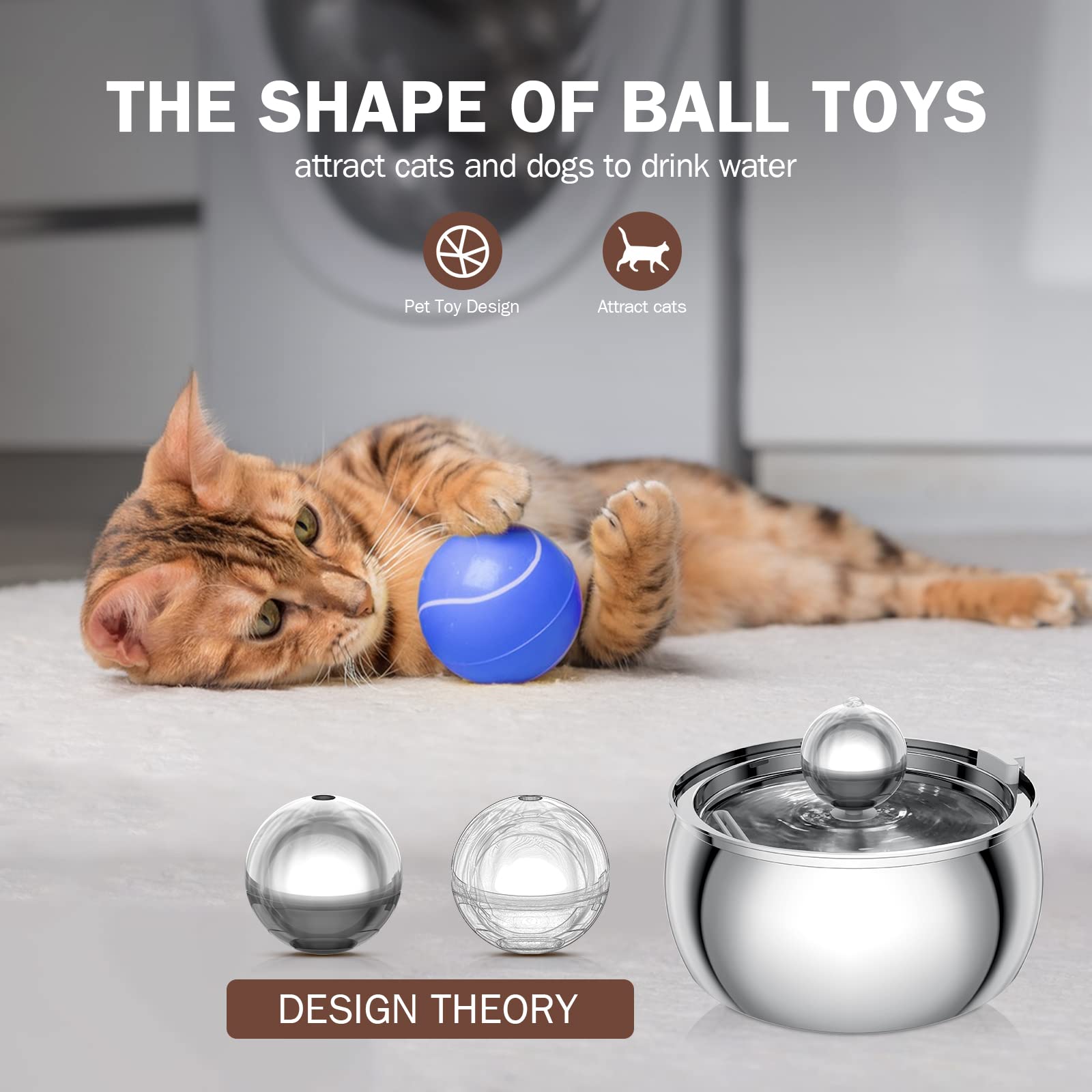 TOMXCUTE Cat Fountain, 4L Drinking Fountain for Cats made of Stainless Steel with Toy Ball Design, Dishwasher Safe, Ultra-Quiet Cat Drinking Fountain with 3 Carbon Filters and 1 Sponge, for multiple