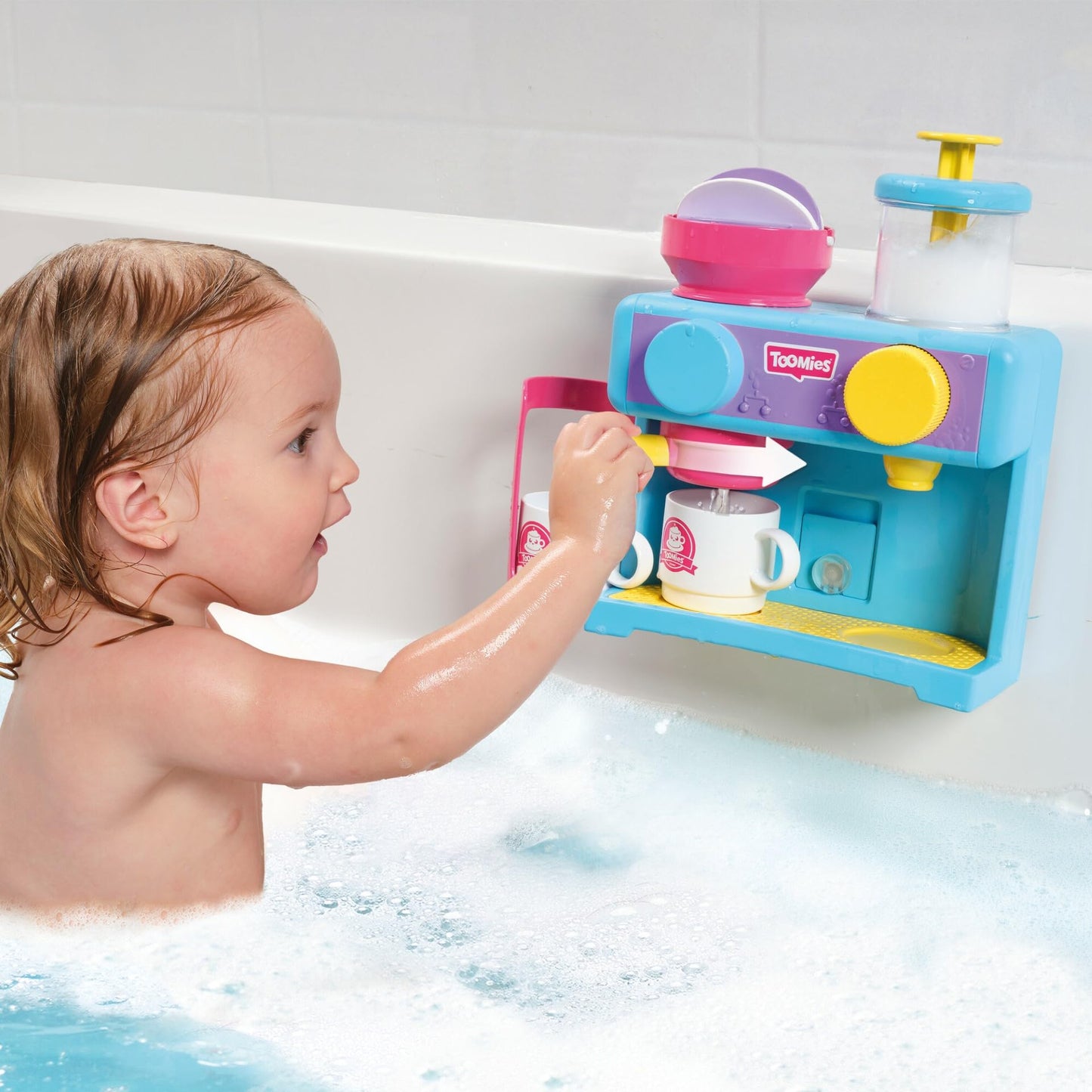 Tomy Toomies Bath Barista - Wall-mounted baby bath toy as a café & foam bath play kitchen for toddlers - Kitchen set: 3 cups, 1 jug, 1 shaker - for girls & boys aged 18 months and up.
