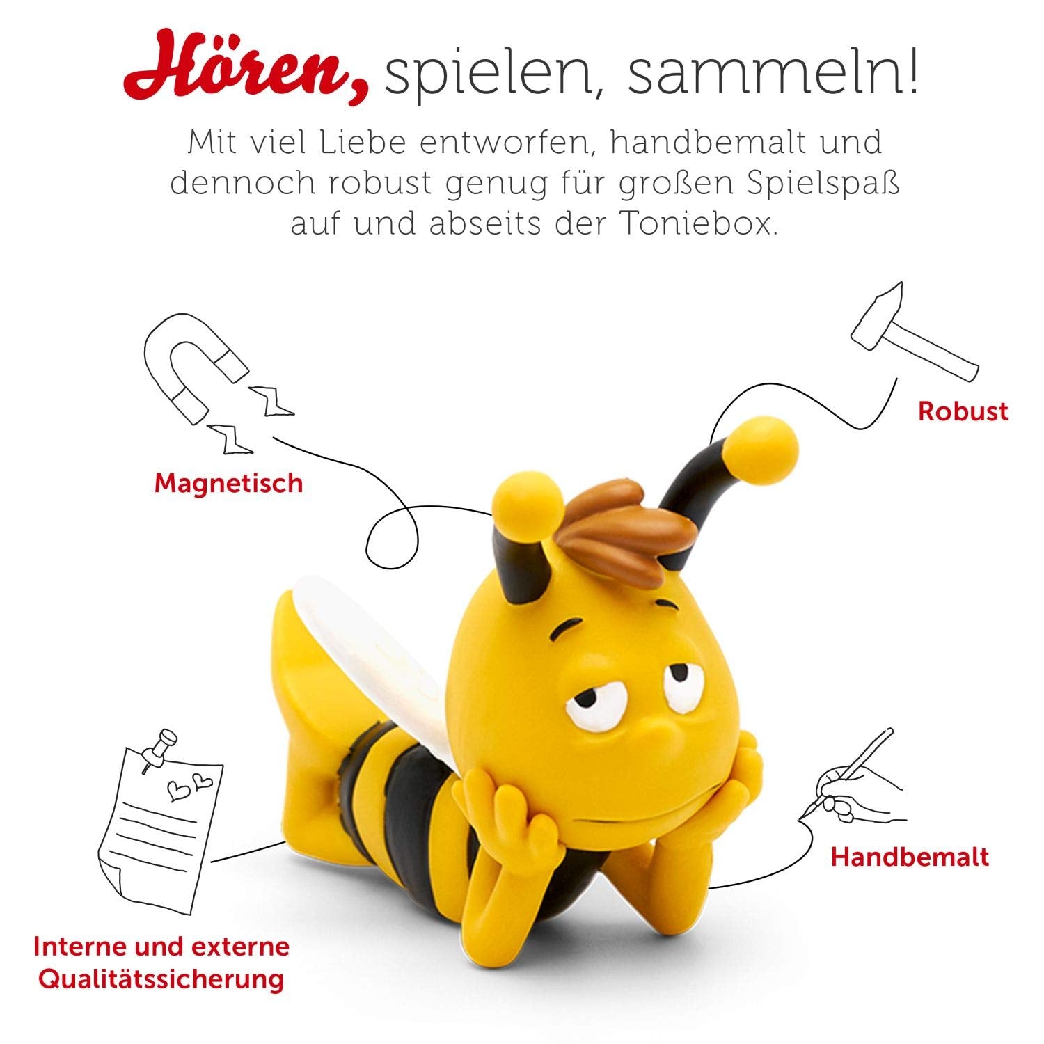 ["Toy fun with tonies - Listening to audio plays becomes a tangible experience with the Toniebox! The Toniebox accessory not only includes a great audio play, but can also be used as a toy figure.","Maya the Bee audio play - This Tonie contains a great audio adventure consisting of a total of 6 wonderful stories about Maya and her friends - with the original voices and music from the TV series.","6 wonderful stories - Crack in the Snail House, The Butterfly Ball, Max and the Bird Wedding, No Sleep for Maya, A Royal Break, and Walter Sneaks In.","How it works - To listen to the exciting children's audio play, simply place the little Maya the Bee Tonie on the Toniebox and you're ready to go.","Delivery & Details - Tonie figure Willi, including Maya the Bee audio play: The Butterfly Ball and 5 more stories, for children ages 3 and up, playing time approximately 68 minutes."]