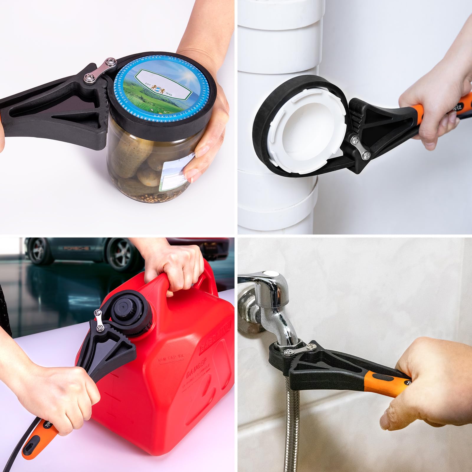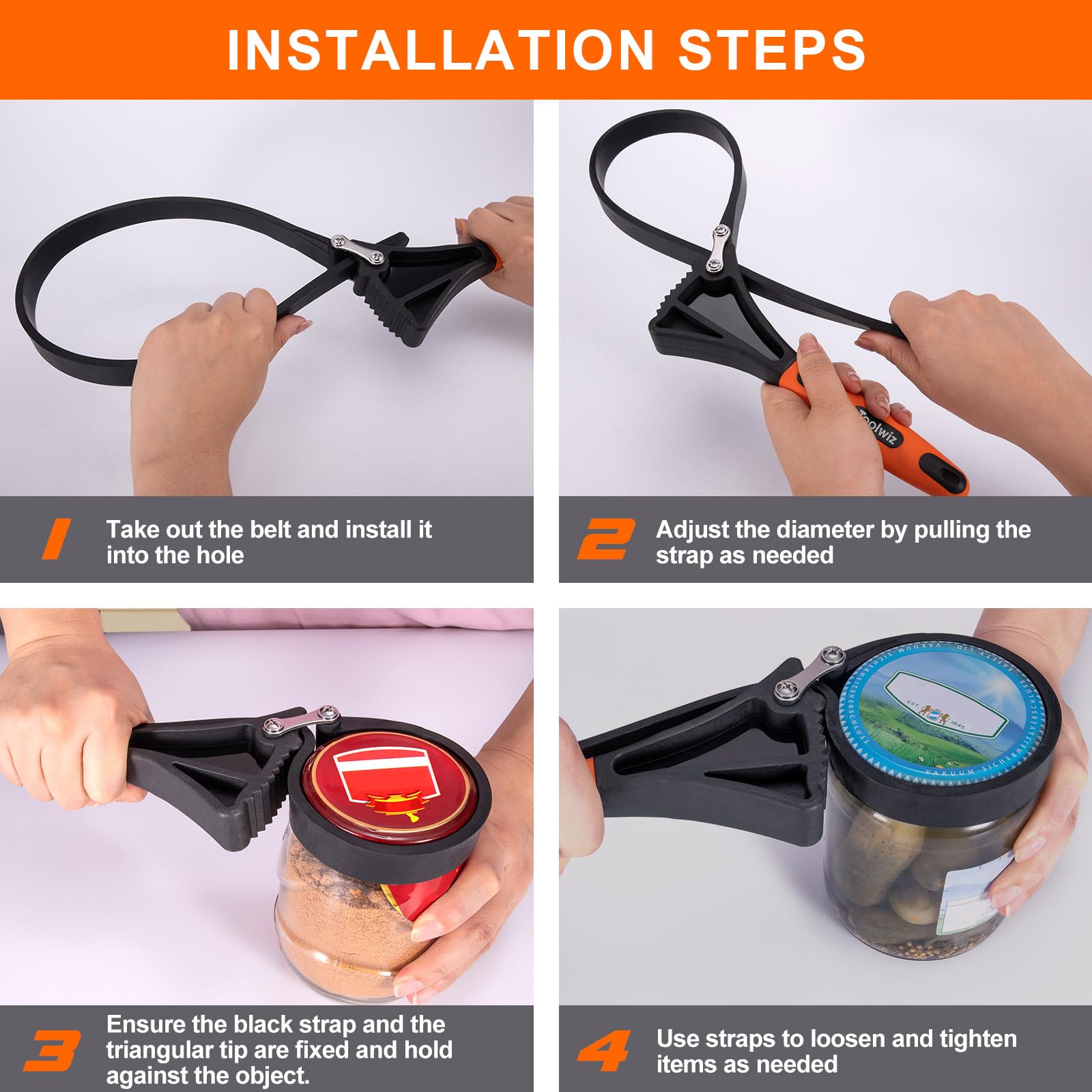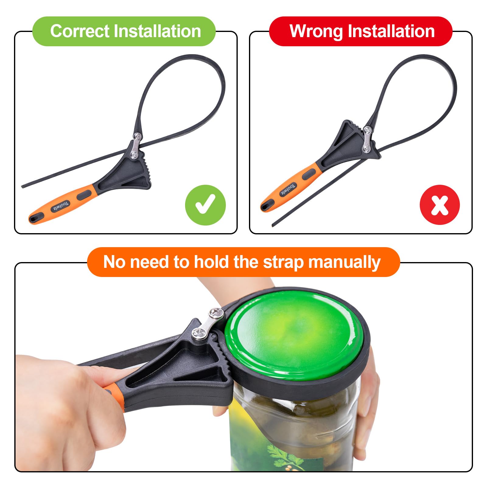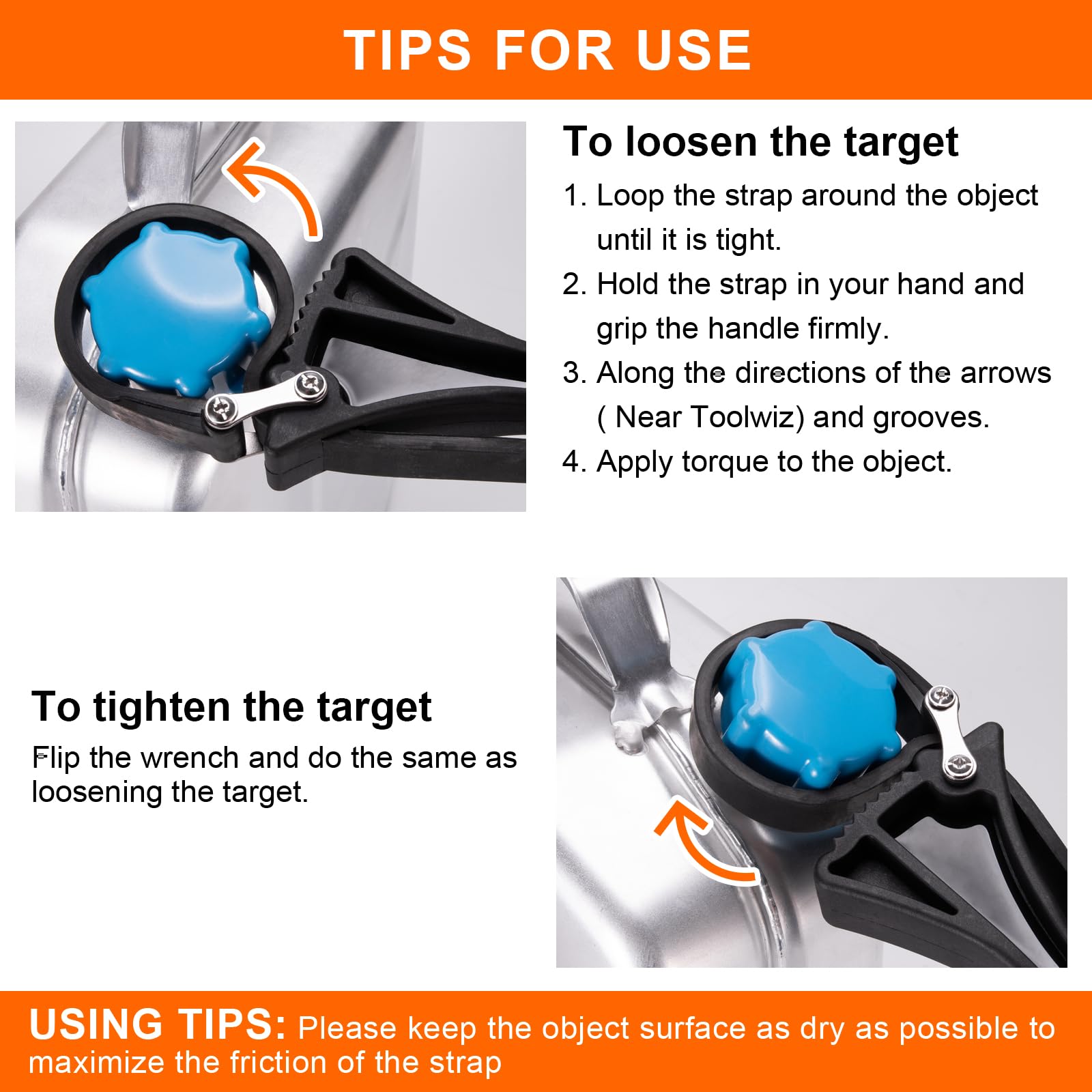 ["2 pieces of rubber band keys: Rubber keys can be used to open/close objects of different shapes and are very convenient when needed. The smaller spanner key can be used for objects with a diameter of up to 4 inches (100 mm). The large rubber key is adjustable and ideal for objects with a diameter of up to 6 inches (150 mm).", "Upgrade design: The Toolwiz rubber band key with belt and handle is connected with #45 steel fastening screws, the insertion angle is wider and firmer during operation, allowing for greater torque to be achieved.", "High-quality material: Toolwiz band key tools are made of strongly reinforced, thick rubber bands, with more wires supporting the rubber band to increase strength and protect the spanner key from easy breaking, making it more durable.", "Wide application: Rubber band keys are great for gripping and turning round or irregularly shaped objects in tight spaces. Suitable for opening/closing pipes, pens, or glass lids.", "Non-slip handle: The handle is made of high-quality nylon and TPR material. It feels soft and comfortable, is non-slip, and has an ergonomic grip that ensures a firm hold and improves work efficiency. Perfect for plumbers, mechanics, craftsmen, arthritic hands, and weak wrists"]