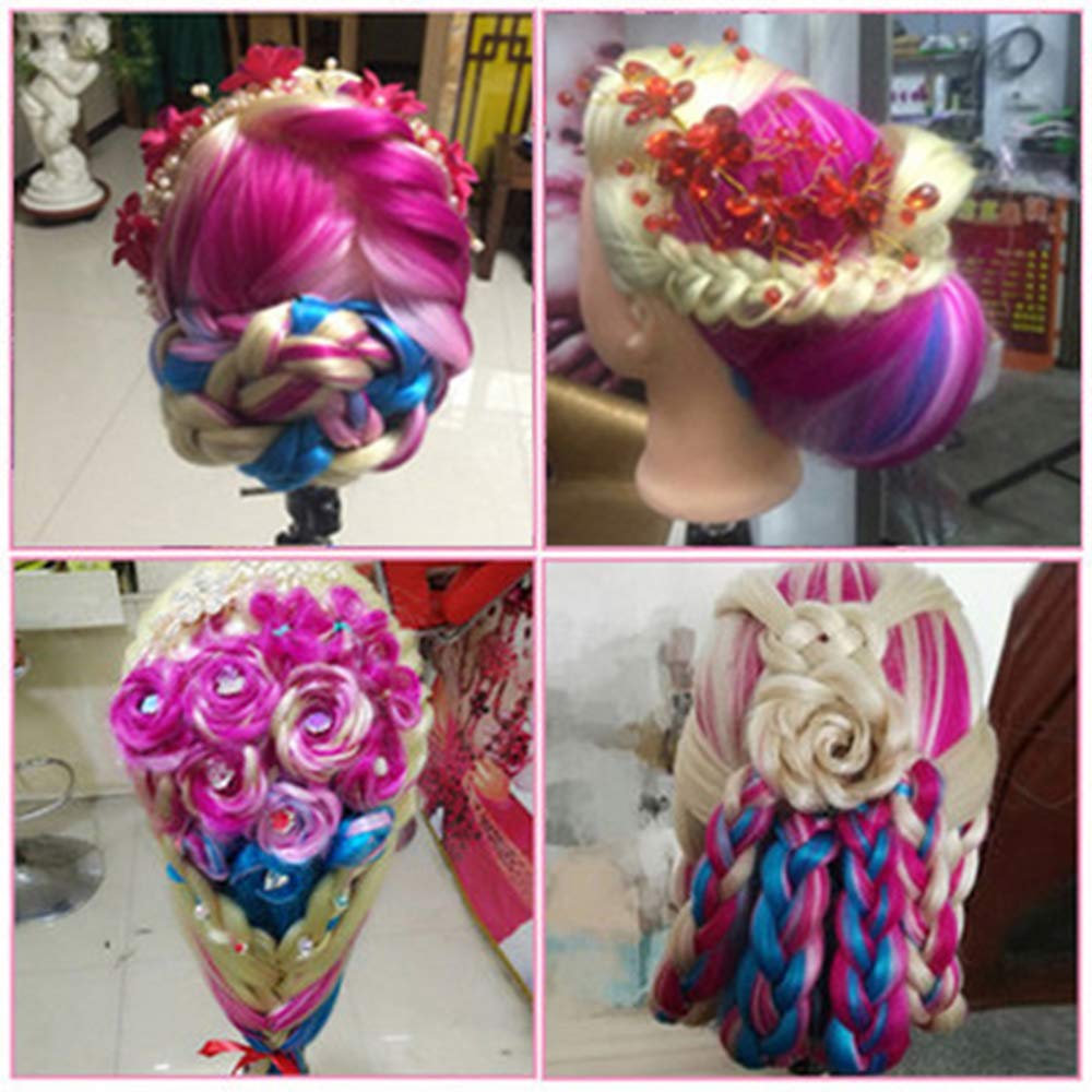["Material: 100% synthetic hair, beautiful and well groomed, smooth, and very easy to work with.","Hair length: 75 cm/29.5 inches, from forehead to back hair tip.","Application: Practice braiding, jewelry display, hair styling, and setting. Notes: Cannot be makeup, blow-dried, straightened, dyed, or curled.","Suitable for: Can be used by hairdressers, beauticians, barbers, and cosmetology students, especially as a great gift for little girls doing hairstyles with their friends.","Caution: It is normal for some hair to fall out at first like our human hair, but it will lessen with repeated use. Gently brush the practice head instead of pulling, to prevent hair from falling out."]
