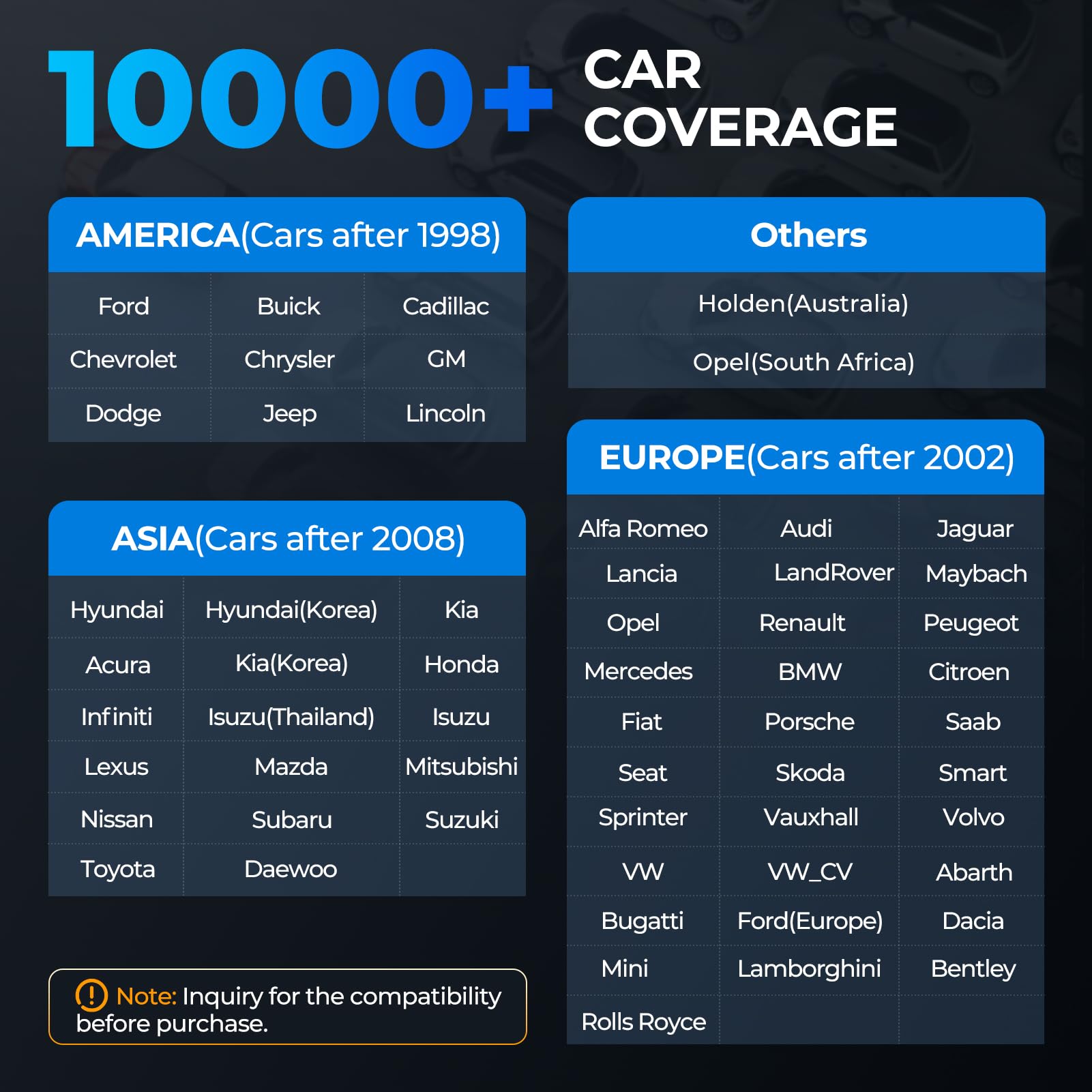 "Wide Compatibility: This OBD2 diagnostic tool is suitable for most US-based cars from 1996, EU-based cars from 2000, and Asia-based cars from 2008"