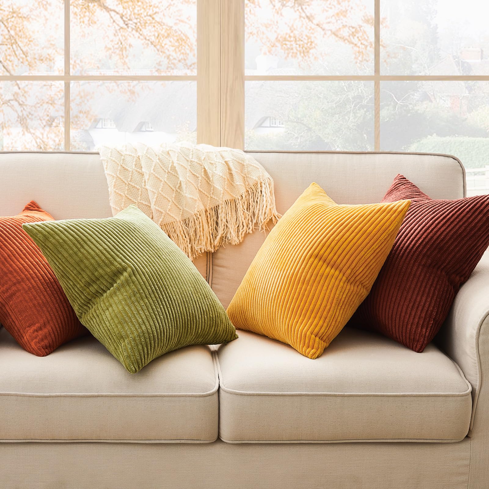 ["Size & Material: 4 pieces 16x16 inch cushion covers without cushion filling. Made from soft corduroy. Very environmentally friendly. Durable. No unpleasant odor. The cushion covers are skin-friendly and ideal for children and pets.","Color Gradient Design: The 4 colors are beautifully coordinated. The decorative cushion covers are super soft and durable. Fun to use. Also great as a gift for family, friends, and colleagues.","Zipper: The invisible zipper with very good sturdy craftsmanship ensures a very clean look. It also has the same color as the cushion covers.","Wash and Care: The cushion covers are easy to care for and do not require ironing. Machine washable and suitable for low-temperature drying. Do not bleach.","Package and Warranty: Set of 4 decorative cushion covers. No cushion filling. Topfinel has over 10 years of experience in the textile industry. If you have any further questions, we are always here for you."]