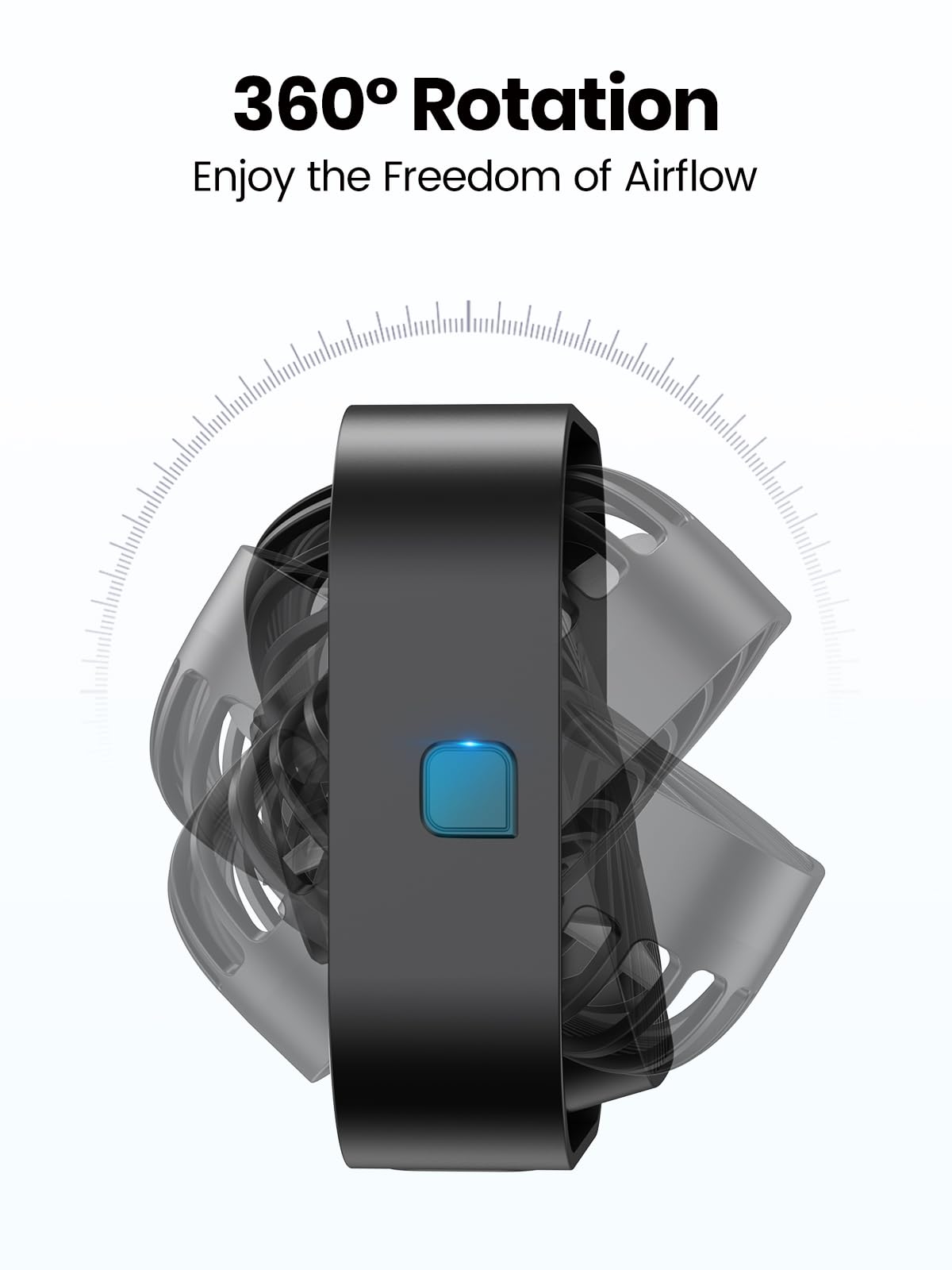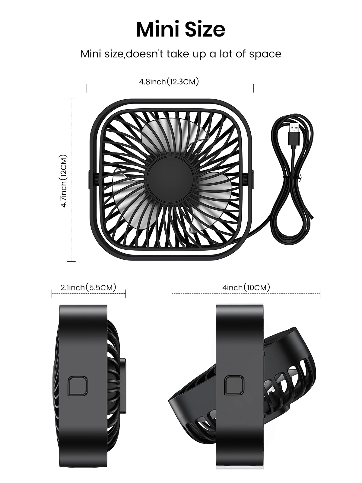 ["Compact desktop fan: This fan is powered by USB and has three speed levels, a 360° rotation of the fan head, and can be operated by devices with USB interface such as computers and adapters. By pressing the button on the back of the fan repeatedly, you can choose between low, medium, and high speeds. The first level offers a speed of 4 m/s, the second of 5 m/s, and the third of 6 m/s.", "360° rotation and stability: The fan head of the electric fan can be rotated vertically 360 degrees, and you can tilt it to the desired angle to cool down quickly. The tabletop fan is equipped with 2 non-slip rubbers on the bottom to reduce vibrations and increase friction, making it more stable and preventing slipping even at high speeds.", "USB-powered: This portable fan is powered by a 1.2-meter USB cable and is compatible with 5V output devices. It can be connected to any device with a USB port, such as PCs, laptops, power banks, USB wall chargers (not included), car chargers, and any other USB-enabled power source. (Note: This fan does not include a battery).", "Quiet upgrade design: The quiet desk fan features 3 curved blades, reducing wind resistance and increasing the available airflow range. At the same time, it is equipped with a powerful, quiet brushless motor to reduce noise. Even at the highest speed, the noise remains at 40-50 dB.", "Compact size and application: With a size of 12 cm, this is a small mini fan measuring 12 x 12 x 5 cm and weighing 160 g, making it lightweight and space-saving. This portable fan is perfect for offices, desktops, dorms, homes, bedrooms, libraries, camping, traveling, or anywhere you need to cool down. The noise level is lower than 50 decibels, providing you with a quiet pleasure."]