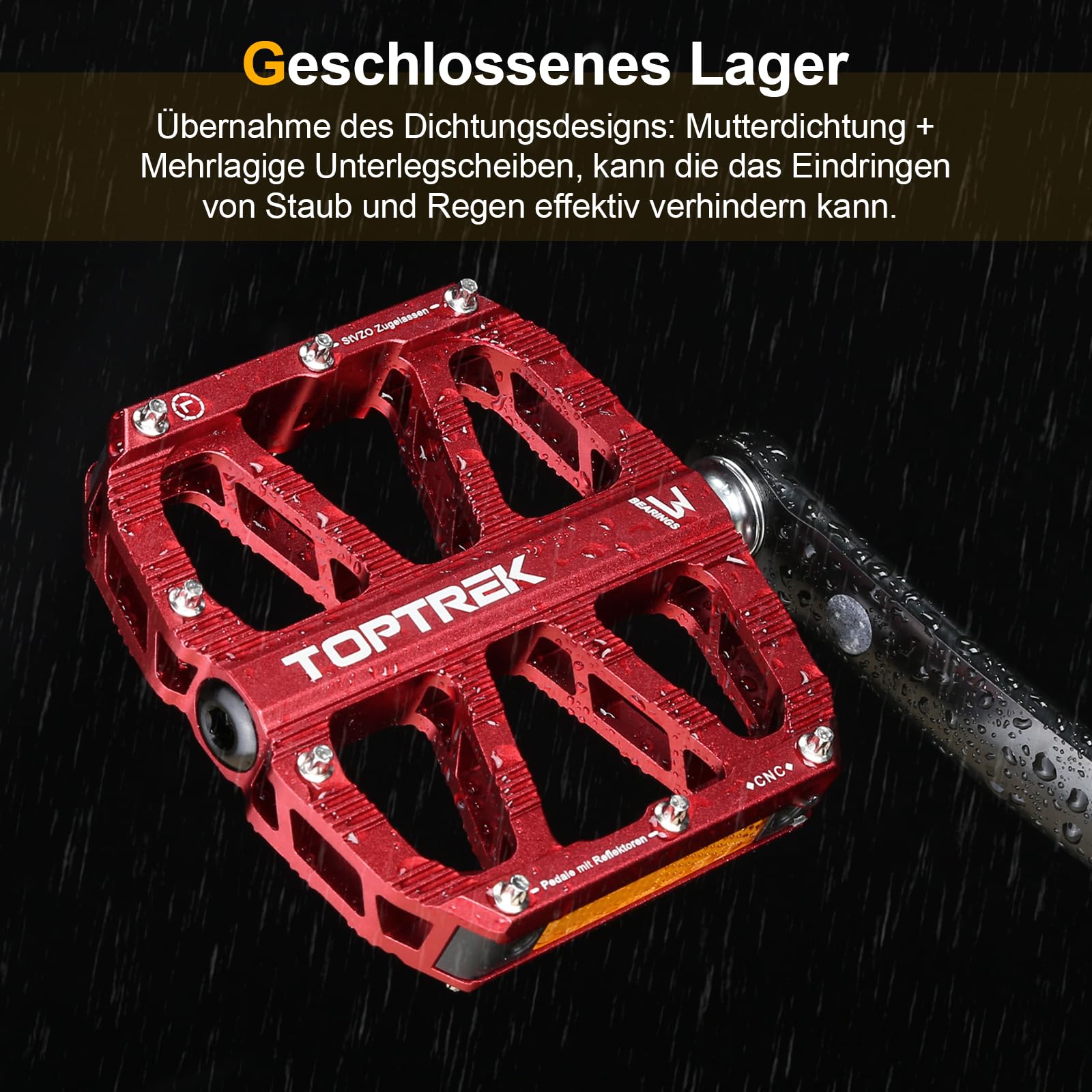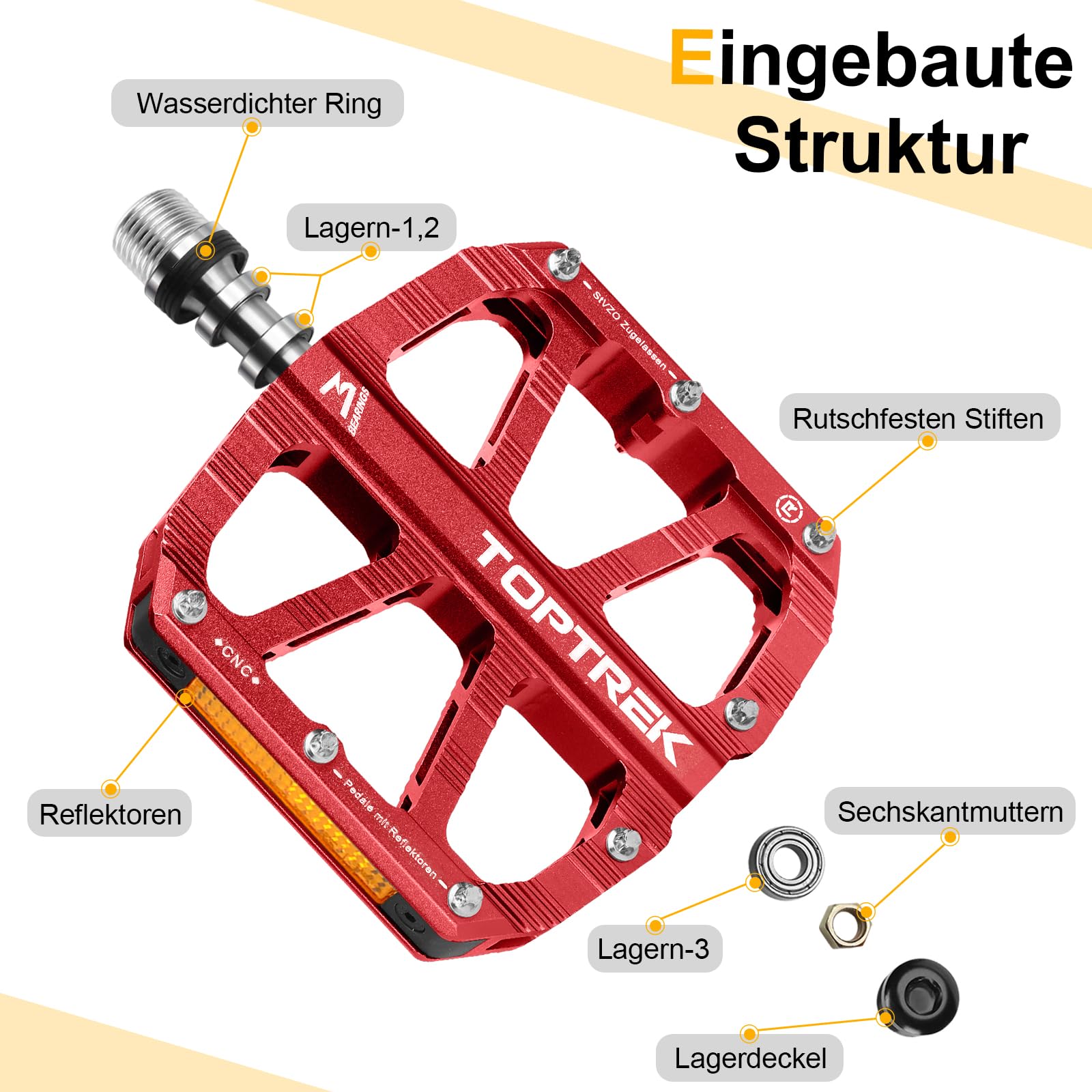 Toptrek bike pedals red with StVZO approved reflectors, CNC aluminum pedals bike MTB pedals non-slip with 3 sealed bearings for mountain bike, BMX, e-bike, road bike