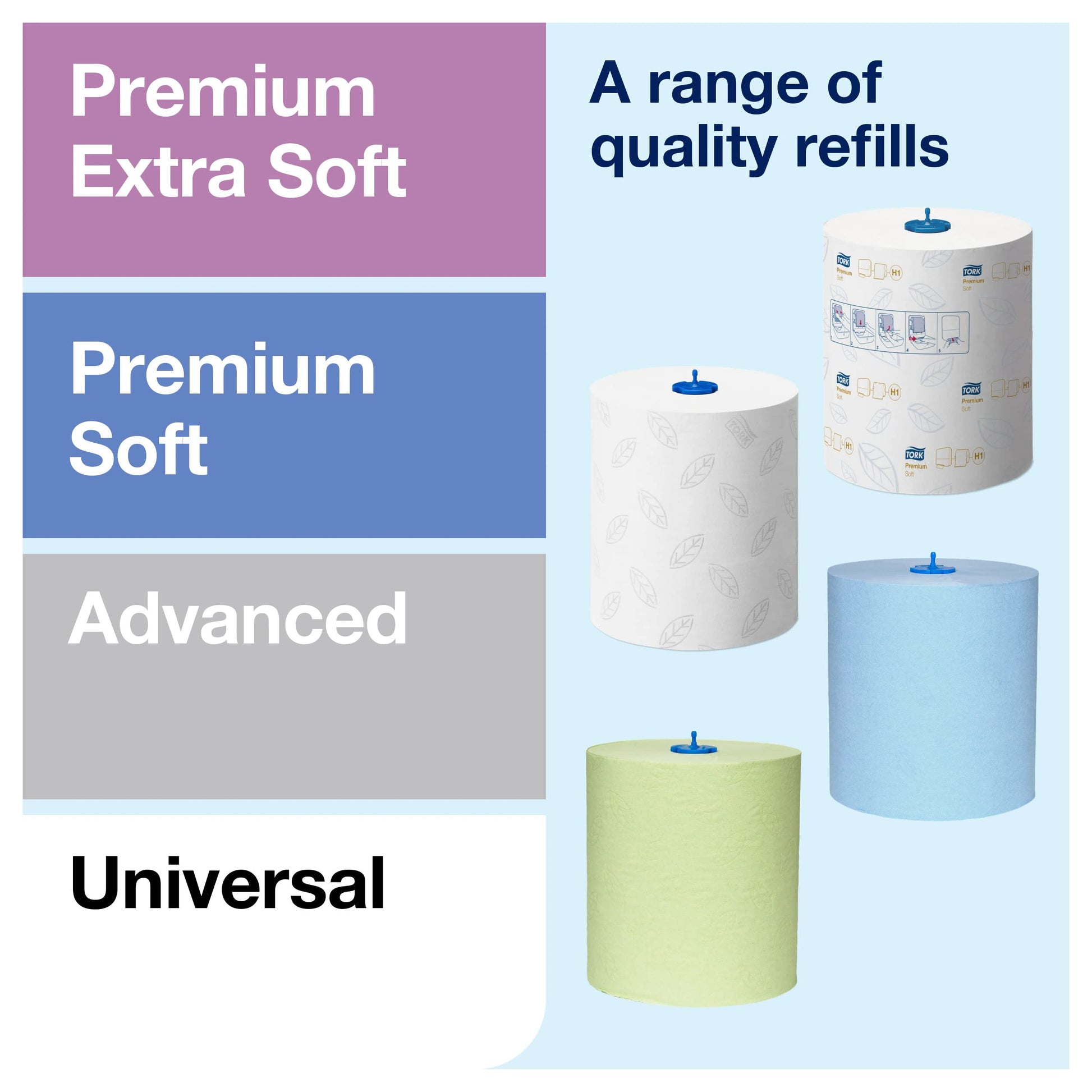 Product 1: The paper towel for high comfort when drying hands: White, soft, tear-resistant roll towels in Advanced quality with pretty, grey leaf embossing, suitable for Tork H1 roll dispensers