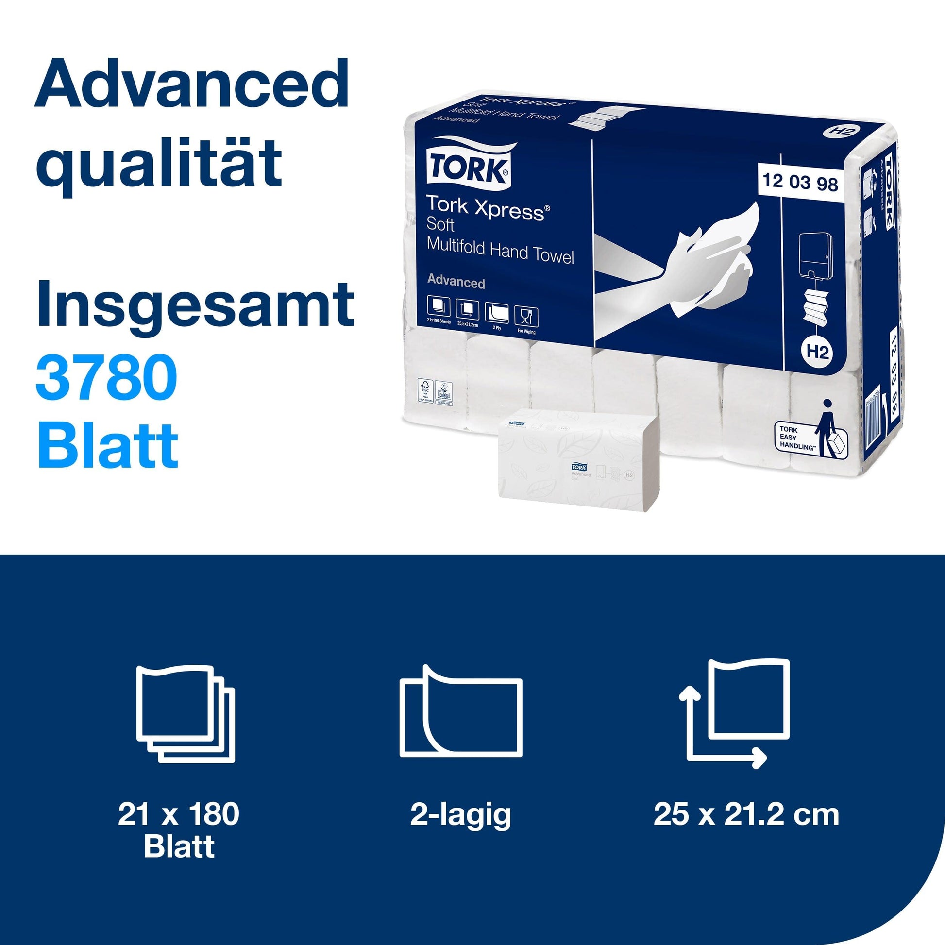 "Give guests extra comfort with these strong, absorbent paper towels in Advanced quality. Reduce towel consumption in your washrooms and improve hygiene with single sheet dispensing. These cost-effective paper towels offer you the perfect price-performance ratio. Perfect for moderately trafficked washrooms: use the towels in hygienic Tork Xpress dispensers. 21 packs, each with 180 paper towels. 2-ply, Advanced quality, size folded L 3.35 in W 8.35 in, size unfolded L 10.08 in W 8.35 in, Suitable for Tork H2 dispensers."