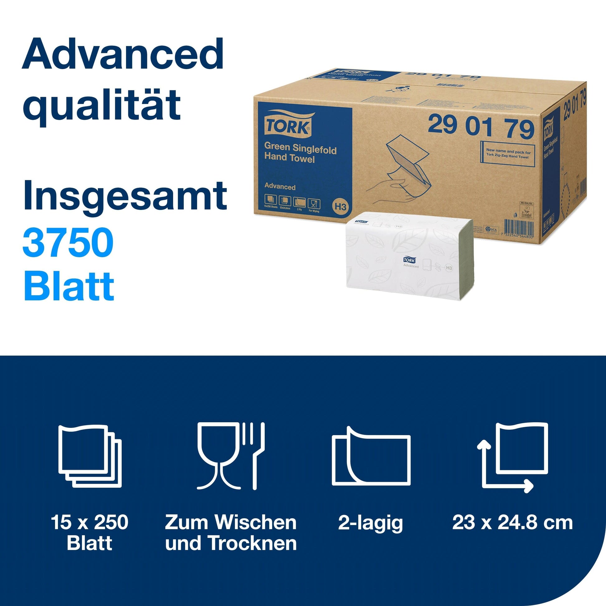Tork Zigzag Towels Green H3, advanced quality, single sheet dispensing, 15 × 250 towels, 290179.