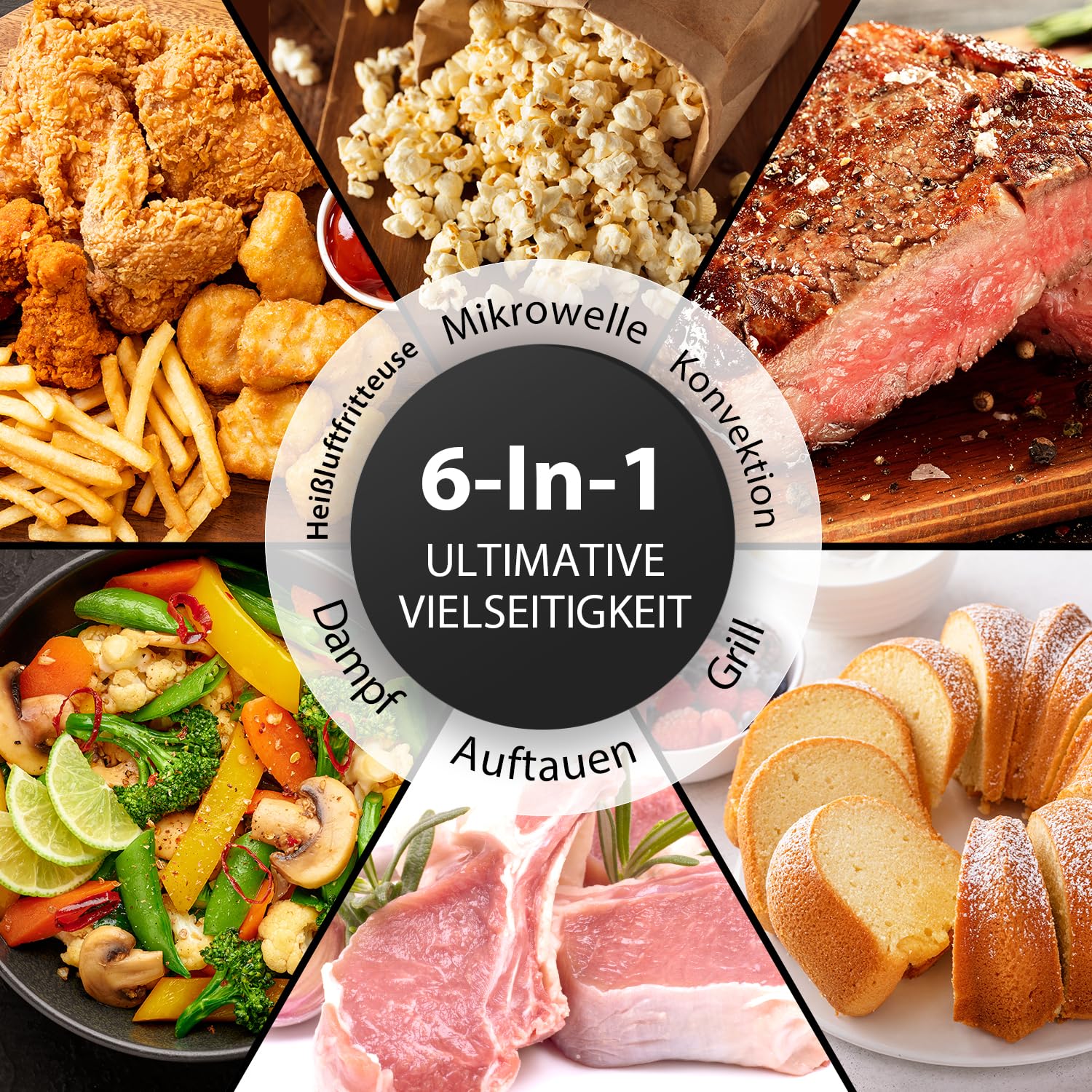 ["【Origin Inverter】The combination microwave oven ORIGIN INVERTER is designed to provide linear power output with precise temperature control and offer a seamless cooking experience. The ORIGIN INVERTER technology reduces heating time and saves energy. This clever technology also replaces noisy transformers and capacitors to reduce the noise level to 57 dB, making it super quiet.","【Chef Defrost】The Toshiba microwave features a professional defrost program that prevents food from getting overcooked on the outside and undercooked on the inside. The power is adjusted to produce precise power control and prevent overcooking.","【Healthy Air Fry Auto Menus】This microwave air fryer oven combo allows you to enjoy fried foods in a healthier way with 7 auto menus, without compromising on taste. Simply add a few drops of oil and let the powerful hot air from the convection fan and heating elements circulate around the food to create a delicious, healthy crispy crust.","【Healthy Steam with Steamer】This Toshiba microwave has a steamer that allows you to conveniently steam your food in the microwave. Water boils below the steaming container while the lid contains moisture, creating healthy and delicious food with locked-in nutrients. Perfect for vegetables or seafood.","【More Functions in One】This versatile 6-in-1 combination microwave provides auto menus for air fry, grill, convection, and combination. And the steam function of the appliance is a great space-saving solution on the countertop, offering quick and convenient cooking in your home. Microwave | Air Fry Auto Menu | Convection | Combination | Steam | Grill, all in one","【Product List】1× microwave oven, 1× glass bowl, 1× higher grill rack, 1× lower grill rack, 1× baking tray, 1× steaming basket, and 1× user manual."]