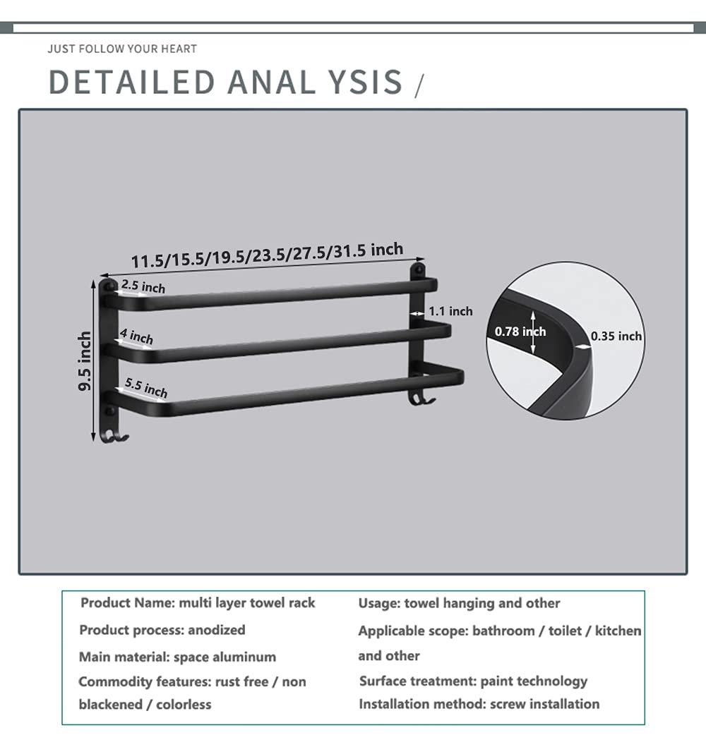 ["Three-layered towel rack. High and low three-bar design, can hang multi-layered towels and bathroom accessories. The large towel spacing allows for breathability and quick drying, effectively reducing bacteria growth.","High-quality materials. The surface is made of high-quality aluminum alloy, lightweight and corrosion-resistant. It is anodized to effectively prevent corrosion and rust, avoiding daily scratches, ensuring durability and long lifespan.","Strong enough. The thick mounting rod makes the towel holder firmer and able to hold a sufficiently heavy bath towel. Perfect for modern homes and hotels to hang and organize your towels, bath towels, and clothes.","Easy to install. Hole installation method, can be easily installed on the wall. All accessories are included and suitable for most walls. Very suitable for bathrooms, kitchens, living rooms, etc. The unique design is easy to clean.","Widely used. Ideal for hanging towels, clothes, etc. in bathrooms. For kitchens, you can hang kitchen utensils and dish towels. Can also be used in hair salons. Can be mounted on the wall, saving a lot of space."]