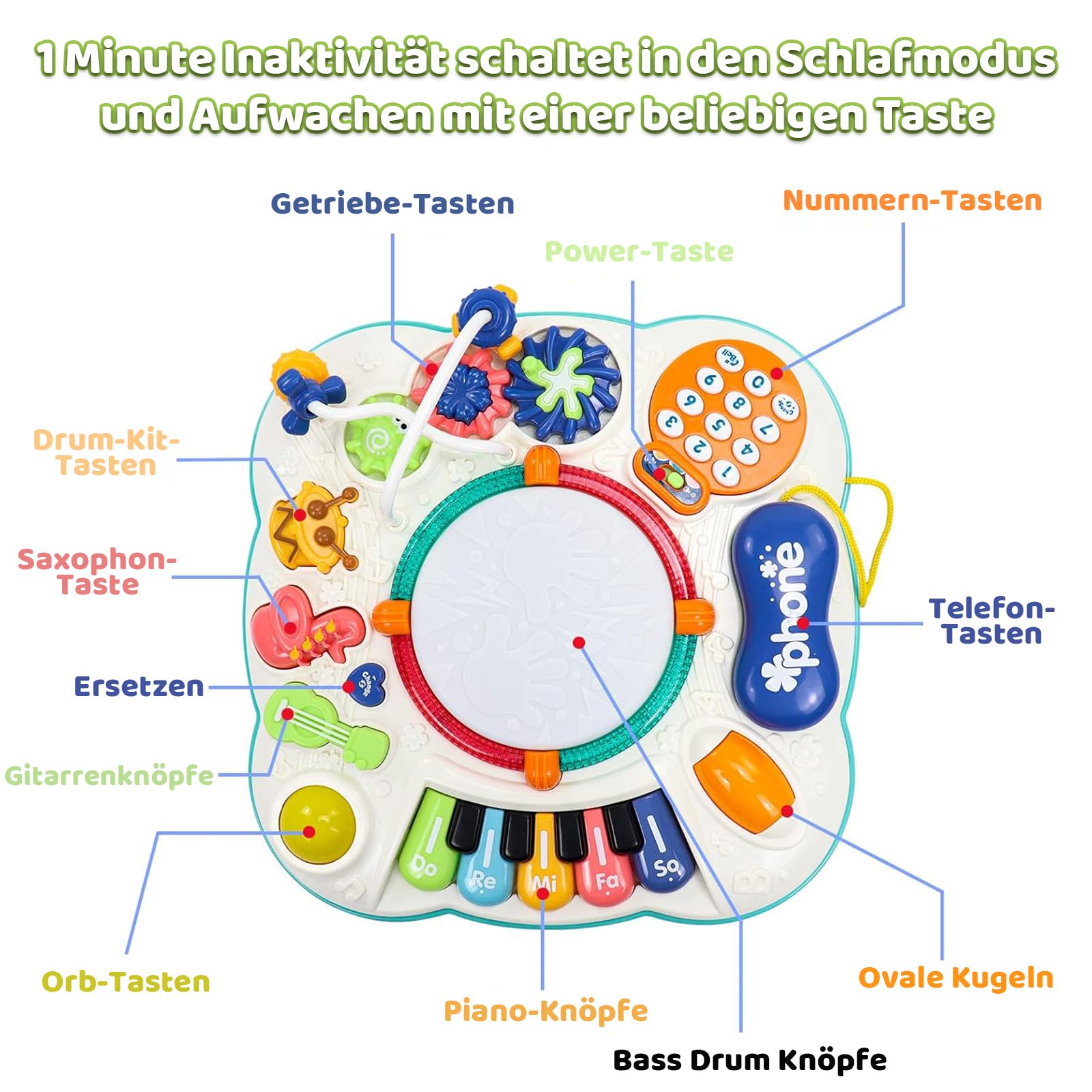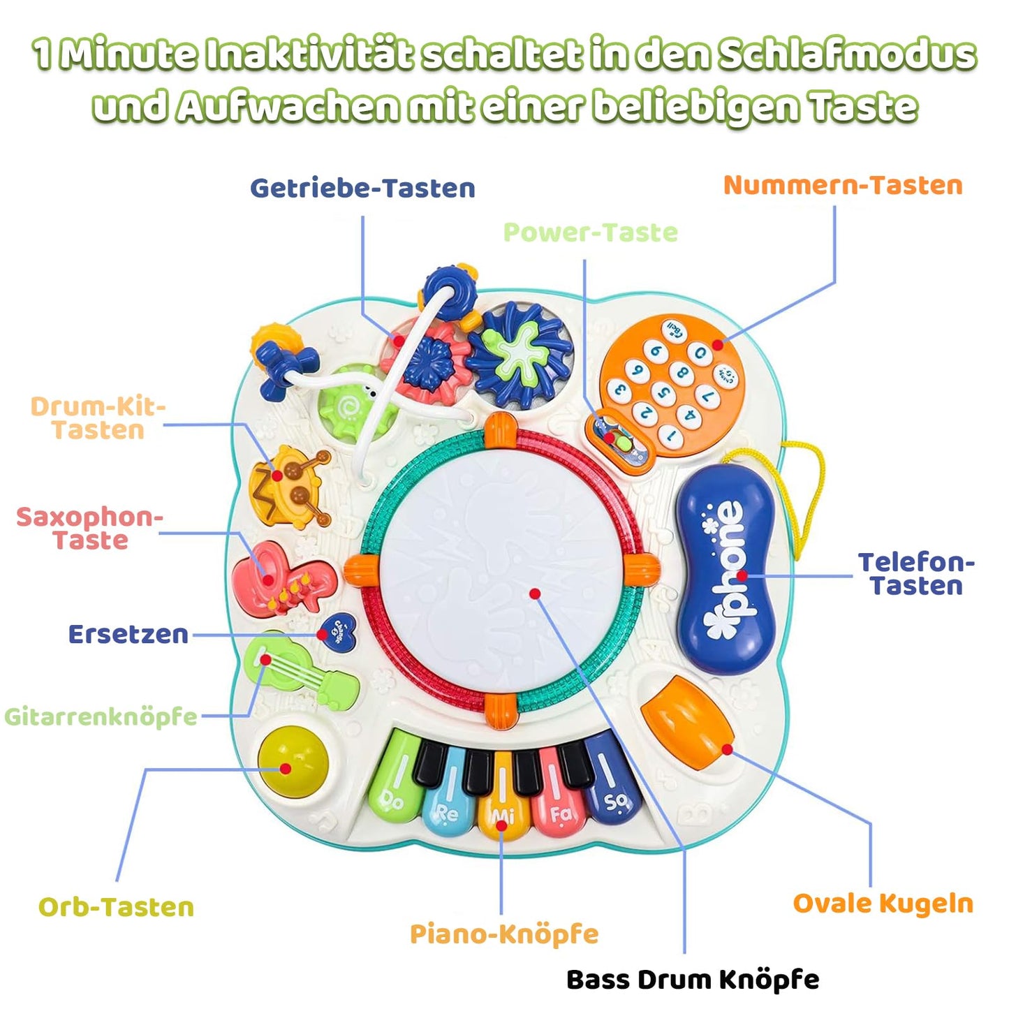["Tabletop Toy from 1 year: This 6 in 1 baby toy includes piano keys, bass drums, guitars, jazz drums, and saxophones. The baby musical toys can play music to promote children's rhythm, stimulating their musical fun and increasing their interest in musical instruments.","Toy From 1 Year: The improved baby activity table adds anti-slip pads to prevent children from falling. The legs of this baby toy are very easy for adults to install. Note: The baby toy is suitable for children from 12 months old. It is recommended that young children sit and play with the children's toy. Young children should be accompanied by parents to play with the baby toy.","Adjustable Volume Baby Activity Table: With the volume control button of this kids activity table toy, you can adjust the music louder or softer and no longer worry about noise. Children can turn the oval ball to play 3 fun sound effects, and press the round ball button to play laughter. Enhance baby's fine motor skills.","Toy for 1 Year Olds: The baby activity center toy is made of safe and high-quality materials, with smooth edges and no sharp edges. And there are no small pieces, no worries about the child swallowing them. The baby toy 1 year light is soft and does not harm children's vision.","Ideal Easter Gifts for 1 Year Old Boys and Girls: The children's toy for 1 2 3 year olds and older is a great Easter gift for toddlers turning 1 year old. The crawling baby can have hours of fun and they will love it."]