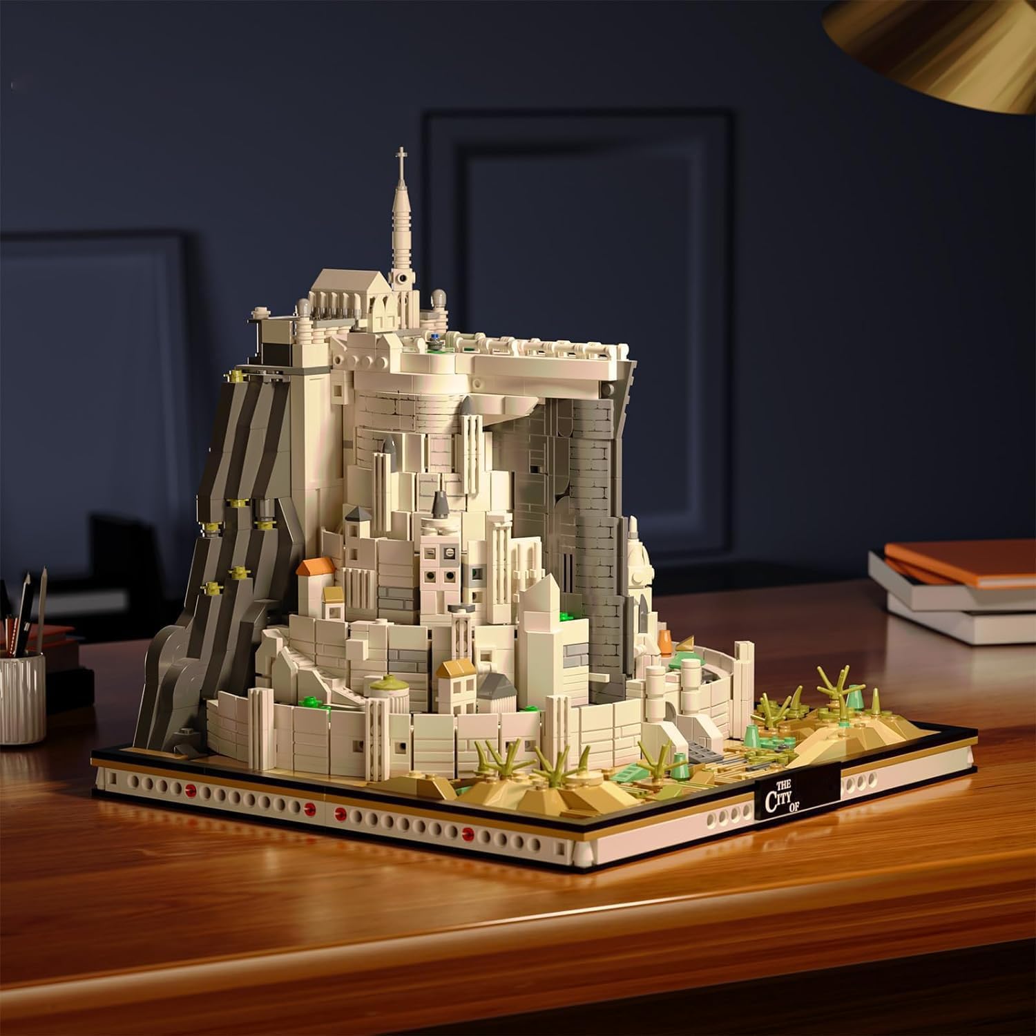 ["Fantasy Castle Building Kit: Immerse yourself in a fantastic world with this detailed castle building kit that replicates classic architecture and takes you on a magical journey. The castle sits majestically on a hill, known for its seven layers of walls and magnificent white palaces. Each section of this set offers unique details ranging from lively markets and residences to the royal palace and the White Tree. Well-crafted fortifications and a cross-shaped garden complete the model, bringing the city's distinctive charm to life.",