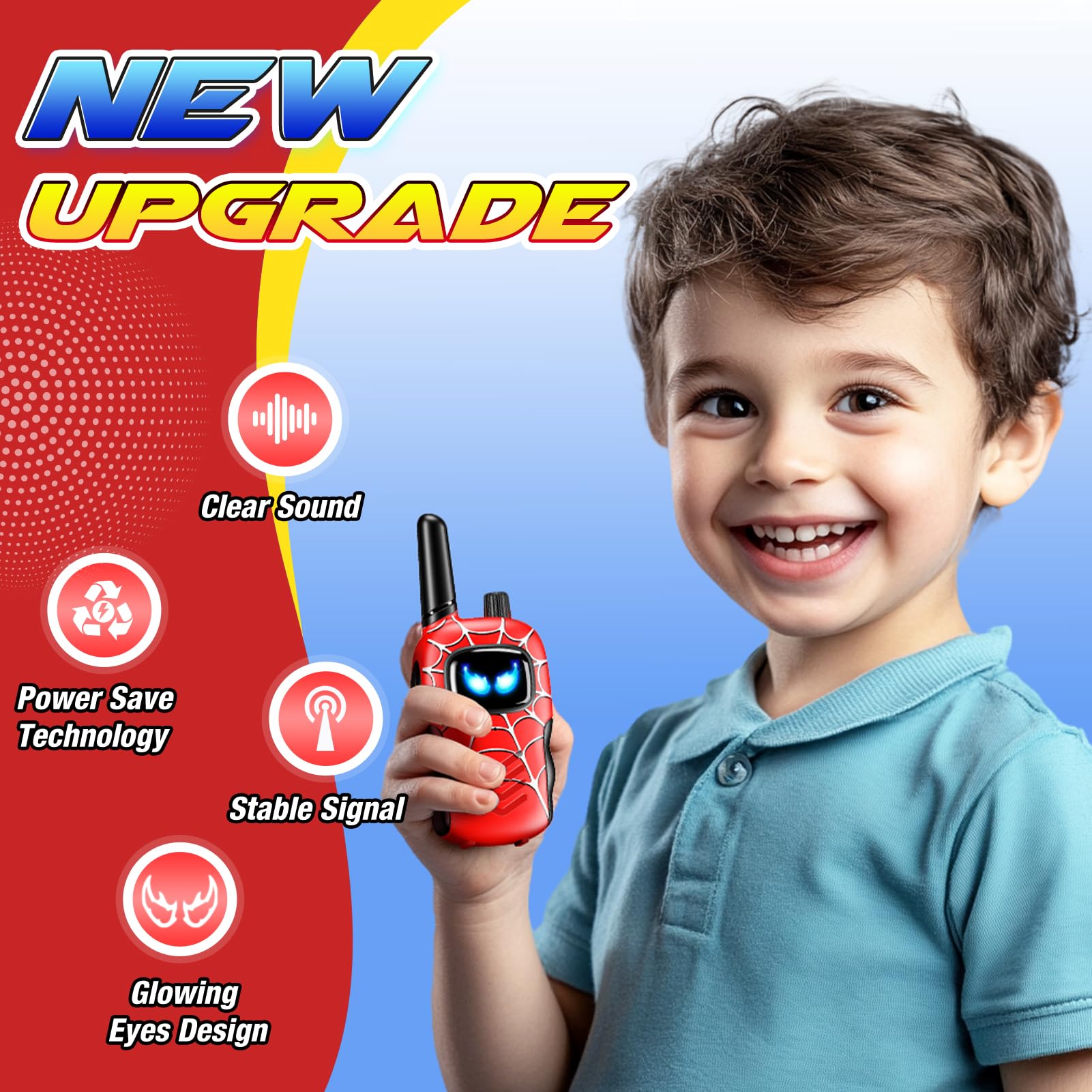 ["Personalized Spider design: Our walkie talkies have a unique spider shape, with glowing eyes that look cool! With updated design and ergonomic layout, kids can easily grip and play with them.", "Easy operation: With simple buttons and one-touch call function, our kids walkie talkies are very user-friendly and weigh only 70 grams, making them easy to carry.", "Clear communication: Stable signal, clear sound, no noise - kids can easily maintain a connection of up to 1000 feet under ideal conditions! Note: Each walkie talkie is powered by three AAA batteries (not included).", "Sturdy and safe: Made from shock-resistant ABS material, our kids walkie talkies can withstand a drop from up to 5 feet, so you don't have to worry about damage from falling.", "Ideal gift for kids: Packaged in a beautiful gift box, our Spider walkie talkies are perfect as Easter, Halloween, Christmas, or birthday gifts for children"]