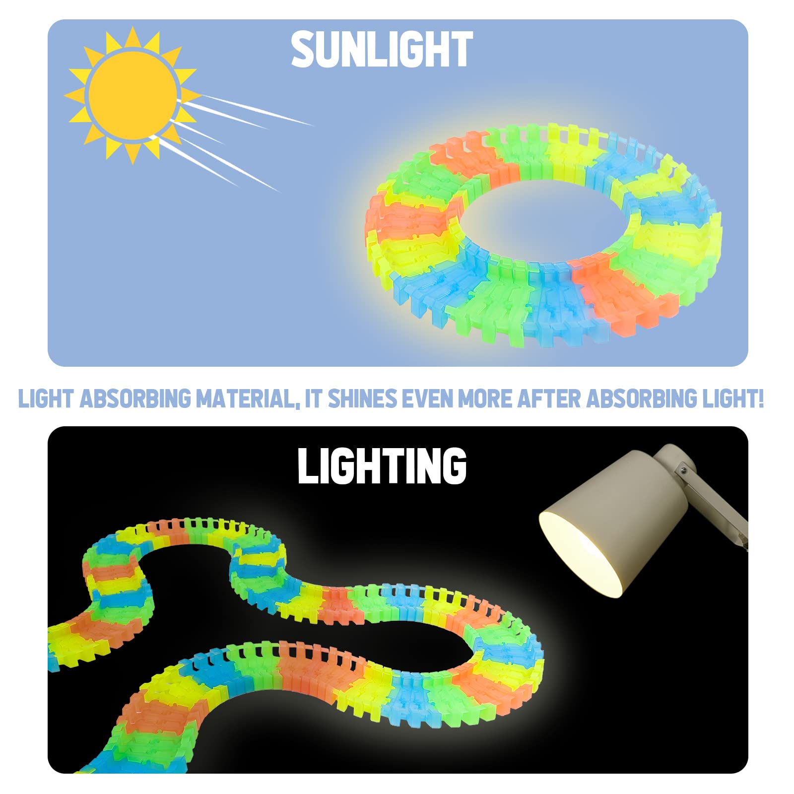 【Glow Tracks Car Toy for 3 Years Old & Light-up Race Track】In the dark environment, the glow cars toy driving on the fantastic lighted race track will surely amaze the child. even in the dark, attach viaducts and race with the 2 included LED car toys. 240 pieces race track for kids 3 years old set can be divided into multiple tracks, multiple children can participate in the game together. Toy car size: approx. 9 * 5 * 5.5 cm (requires 2AA, not included).