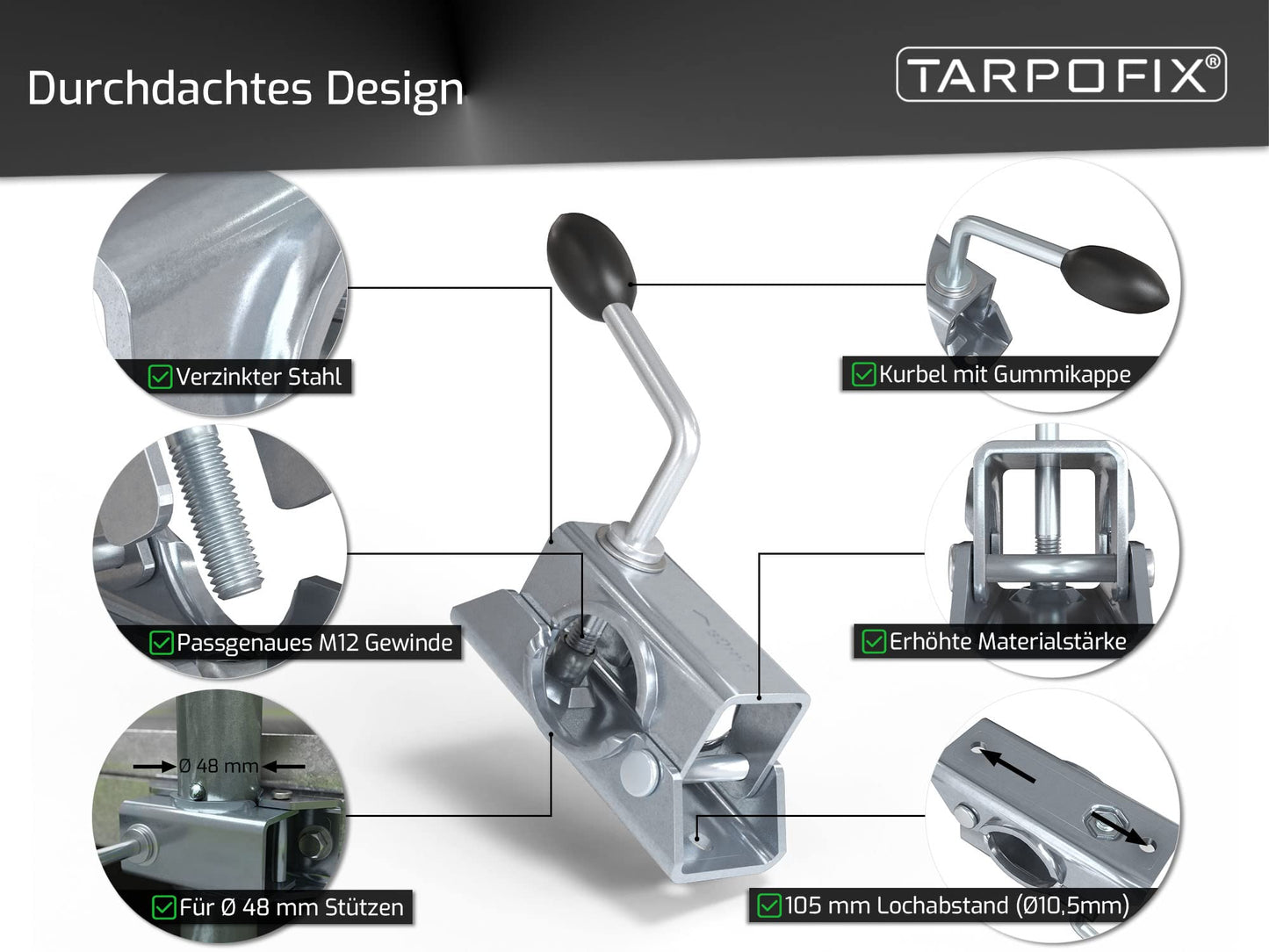"Extra Strength - With its increased material thickness, the clamp brackets for car trailers can easily withstand extremely high loads. A high-quality M12 thread ensures that the jack wheel or support can be securely & firmly attached.",