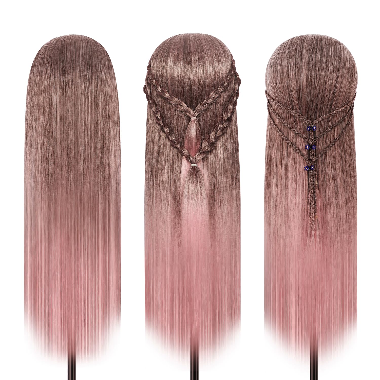 Training mannequin heads, 28 inch practice head styling head for hairdressers made of 100% synthetic fiber hair. Comes with free clamp and DIY braiding set. Gradient pink color.