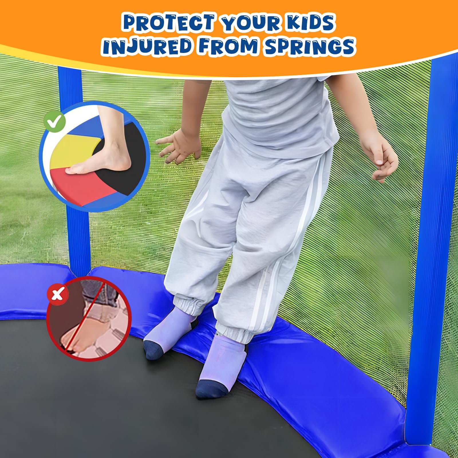【270° all-around protection for maximum safety】 The extended 270° protective shield encloses the trampoline frame and protects children from exposed springs. The combination of 1 mm PVC, 2 cm padding, and dense PE base ensures comfort, safety, and long-lasting protection while jumping.