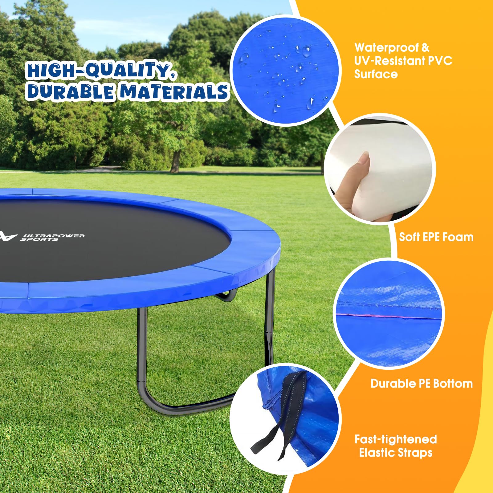 【Easy installation & compatible with springs from 5.3 in to 8.7 in】 Fits all standard trampolines with a 10 ft diameter and springs from 5.3 in to 8.7 in. The elastic straps and wrap-around design allow for tool-free installation in minutes. Ideal as trampoline accessories, replacement mat, or safety upgrade - ULTRAPOWER SPORTS guarantees easy maintenance and high functionality for families and facilities.