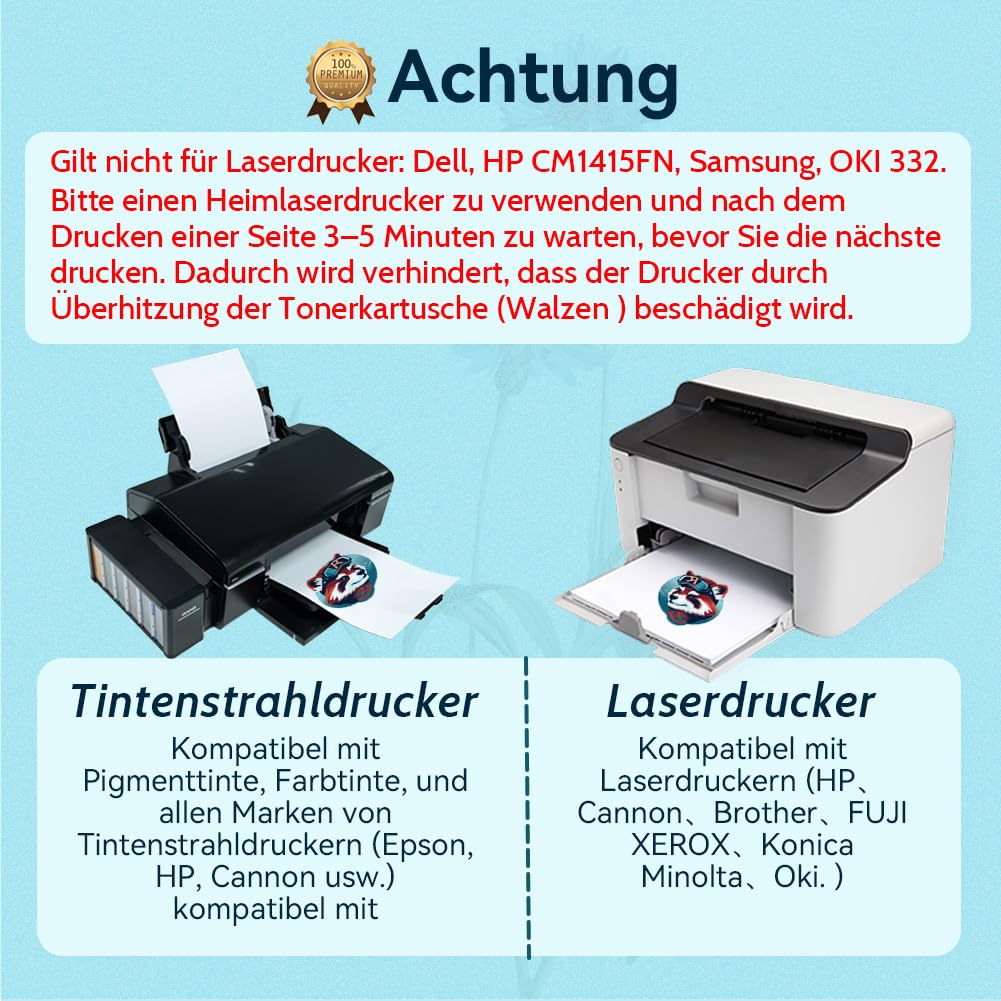 "REQUIREMENTS: Laser Printer (Please use a home laser printer and wait 3-5 minutes after printing one page before printing the next. This prevents damage to the printer from overheating the toner cartridge/rollers.), Not for Laser Printers: Hp CM1415FN, Samsung, OKI 332 and Dell or Inkjet Printers (including Epson, HP, Brother, Canon and more) | Laserjet, Pigment Ink, Dye Ink | Scissors or Cutting Plotter (including Cricut and other brands) Any kind of iron or heat press Silicon paper (included in packaging)."