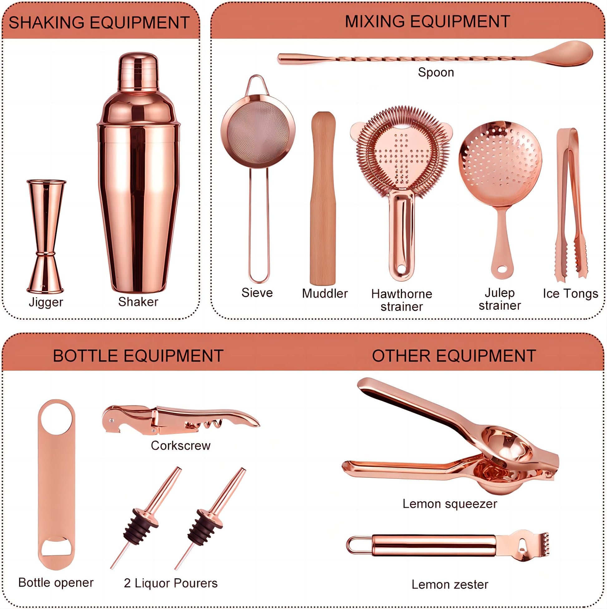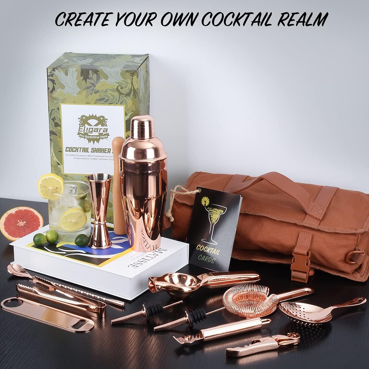 ["A COMPLETE SET OF BARTENDING TOOLS: The 17-piece Bartending Set from Eligara is a complete set of bartending tools that includes everything you need. In addition to the tools, we have also prepared a cocktail recipe guide for you. This means that even if you are not good at bartending, you can easily start and mix delicious and unique drinks with the help of our guide. With the Eligara Bartending Kit, you have everything you need to become a skilled bartender and impress your guests.","SELECTED MATERIALS - STURDY AND DURABLE: The Eligara Cocktail Shaker Set is made of high-quality food-grade 304 stainless steel, which has a finely polished surface that resists rust and wear and is effortless to clean. Additionally, the set is stored in a sturdy canvas bag with a vintage-style design, which protects it from moisture, dust, and bumps. The bag features some integrated elastic bands and small pockets to keep everything organized and prevent collisions and friction.","PORTABLE DESIGN - TRAVEL COMPANION: The portable bar set from Eligara is designed to be compact and easy to carry. It comes with a comfortable soft leather handle and a durable shoulder strap that won't tire you out during extended use. This kit is a great travel companion and ideal for camping, parties, BBQs, and mixing cocktails on the go. Now you can create your own cocktails anytime, anywhere!","PERFECT GIFT IDEA - UNIQUE AND SURPRISING: Eligara has created a unique gift box for our professional bartender kit. The vintage carrying bag makes a statement and is an impressive gift. It's the perfect surprise for anniversaries, Christmas, Father's Day, birthdays, or any other special occasion.","SHOPPING MADE EASY - 100% SATISFACTION: At Eligara, we implement strict quality control measures during the manufacturing, production, and shipping processes to ensure that our products meet our high standards. We are committed to selling every product with 100% sincerity, and if you have any questions or concerns about our bartender bag, please let us know. Our team will provide you with professional and satisfactory service to ensure that you are completely satisfied with your purchase."]