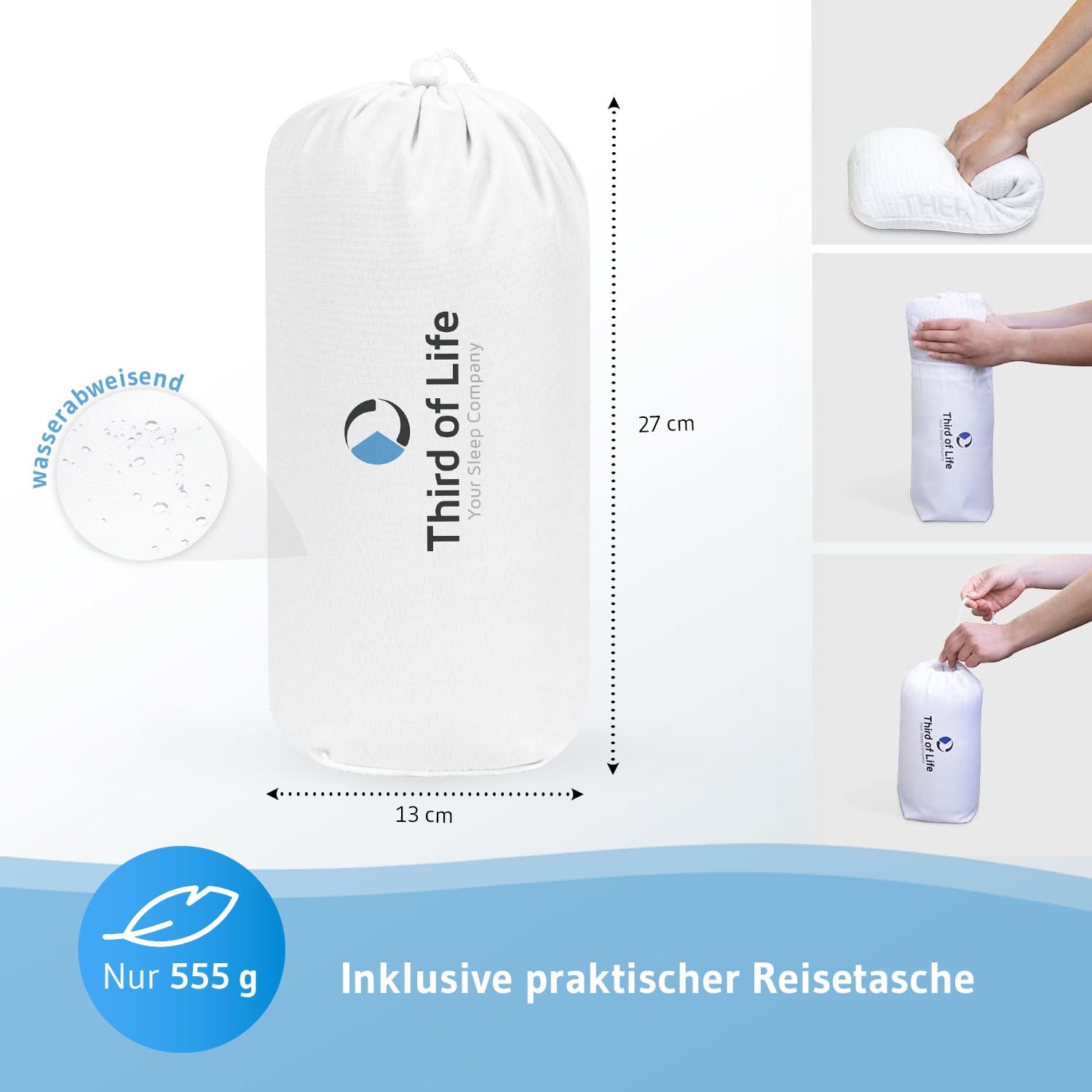 ["Thermoregulating travel pillow VOLAR from Third of Life, official Regeneration Partner of the DSV-Olympic-Team 2024", "➥ COMFORT TO GO - Whether outdoors camping, traveling, in a hotel or for a short power nap, our VOLAR neck support pillow provides a comfortable sleeping spot anywhere. Perfect for on the go!", "➥ ERGONOMIC & HYPOALLERGENIC - The visco foam provides natural support to the cervical spine (CWS) and adjusts perfectly to your neck-head area. Thanks to its natural resistance to dust mites, the travel pillow is ideal for allergy sufferers & asthmatics.", "➥ TEMPERATURE & MOISTURE MANAGEMENT - Thermoregulating microcapsules in the washable cover act warming or cooling depending on body temperature. Ventilation channels integrated in the memory foam ensure optimal air circulation. For a healthy sleeping climate!", "➥ LIGHTWEIGHT & SPACE-SAVING - The foam pillow with a free black pillowcase is extra small & light. Thanks to the practical travel bag, it can be easily rolled up & packed away space-savingly."]