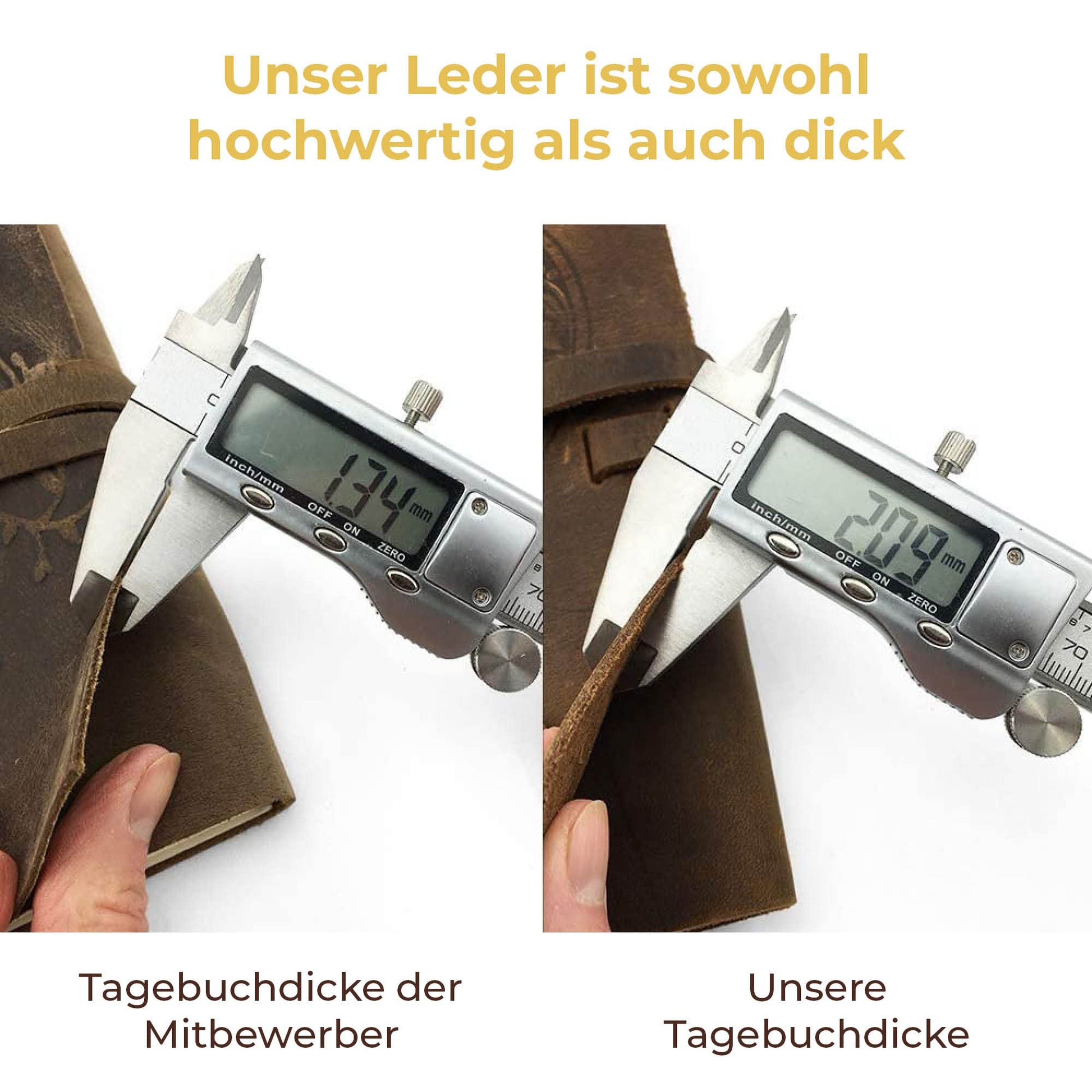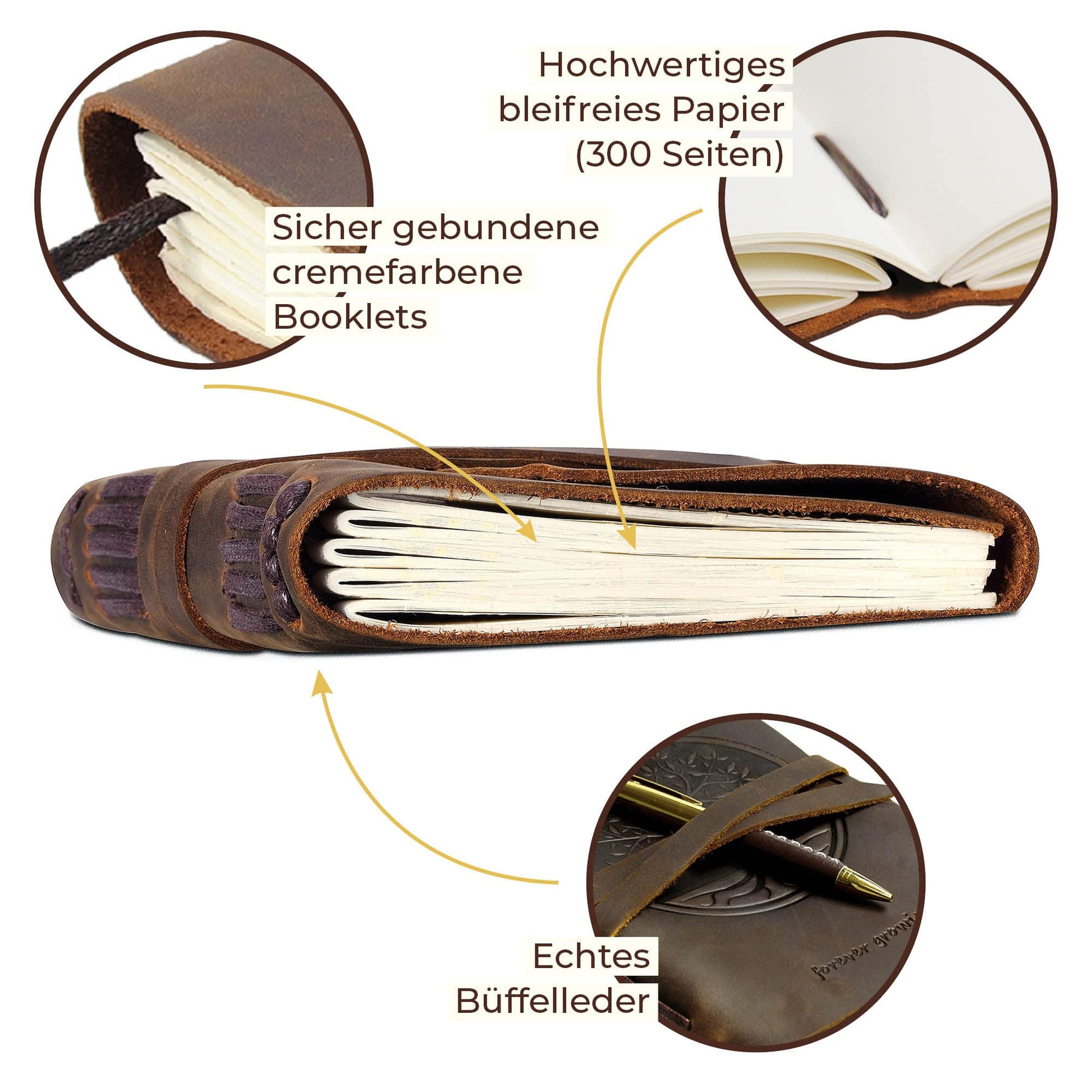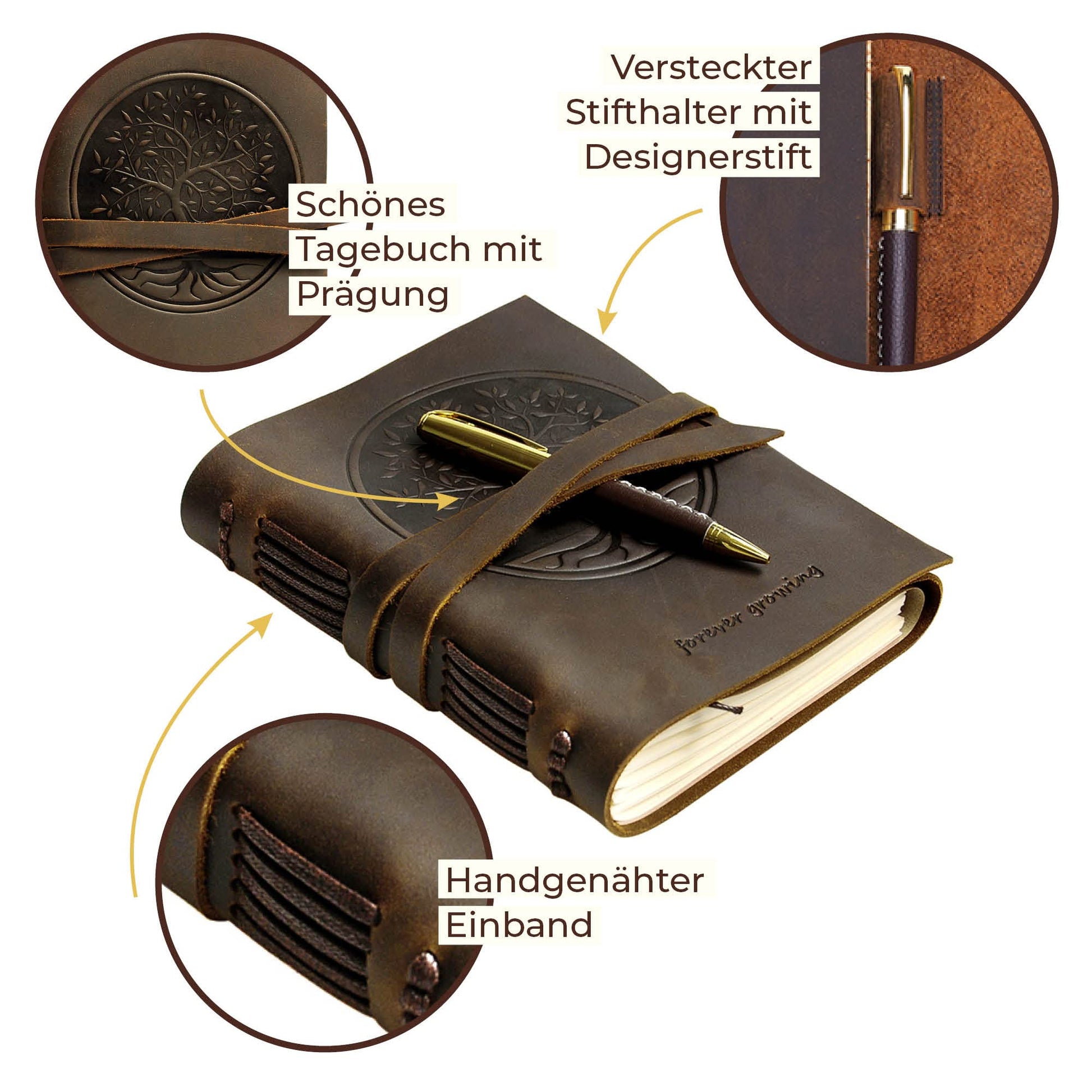 ["✑ EMBOSSED RUSTIC DESIGN LEATHER JOURNAL with a Tree of Life front cover made of crazy Horse Leather - soft feel, delicate yet super tough with a wonderful old leather smell. Distressed look & treated with special oils so stains fade when rubbed. Decorative stitching on spine gives this beautiful book a shadow souvenir charm","✑ STYLISH GIFT - sketch and draw to your heart's content in this stunning buffalo leather notebook for Mom, Dad, family & friends. Immediate in this beautiful brown leather bound diary to write, as this unique leather diary set features a stylish pen, hidden pen holder loop, and jute bookmark","✑ QUALITY CREAM PAPER 300 thick smooth pages without bleed with fountain pen. These timeless journals are not refillable, it's a kind of collector, to keep memories, daily plans, or ideas for novels. The antique leather straps enclose your retro diary to protect your notes and thoughts","✑ PRACTICAL A5 21x15cm perfect writing journal for a writer at home, at university, or while traveling. Ideal as a men's journal or pocketbook for women. Perfect for writing, drawing or sketching, photo album, travel records, businessman, hunting logbook, journalists, pregnancy diary, meal planner, mindfulness journal, and Instagram scrapbook. We help families in Africa by donating a % our profits to charity Afrinspire","✑ SATISFACTION GUARANTEED in the unlikely event you don't fully love your sketchbook, you can request a full refund or free replacement up to one year. Plus your purchase helps families in Africa as we donate a percentage of our profits to charity"]