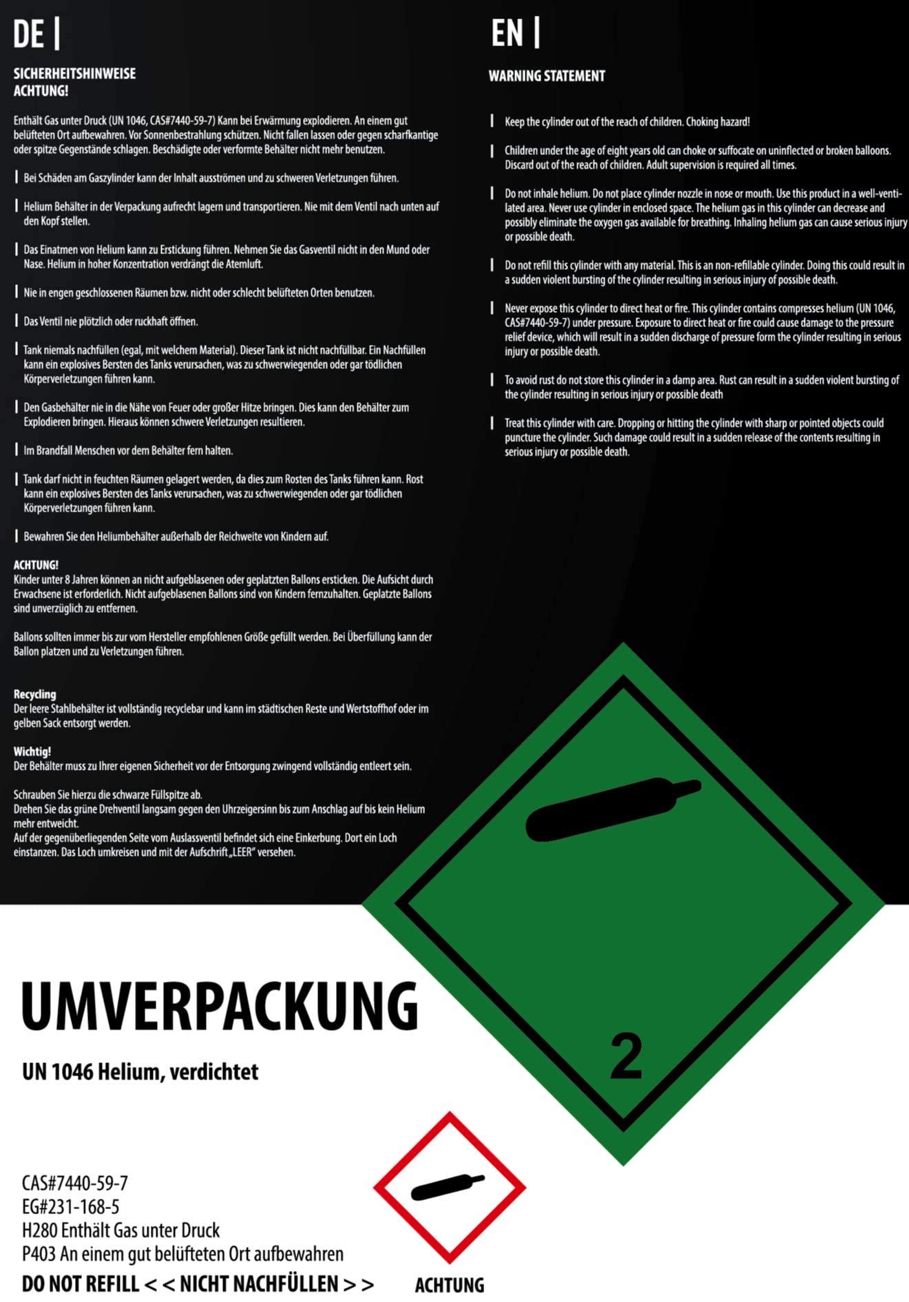 ["Easy to use: You will receive a helium tank for up to 50 balloons with a diameter of 23cm","For filling: Latex balloons, foil balloons, heart-shaped balloons, LED balloons","The helium is sufficient for approx. 45 - 50 balloons with Ø 23cm or approx. 25 - 27 balloons with Ø 28cm or approx. 12 balloons with Ø 35cm or approx. 25 - 27 round foil balloons with Ø 45cm.","For any occasion: Ideal for quickly filling helium at your location. For example, for weddings, birthdays, Christmas parties, corporate events, or city festivals.","Suitable for both latex balloons and foil balloons. When filled with helium, the balloons float, depending on the material, between 6 hours and up to 7 days"]