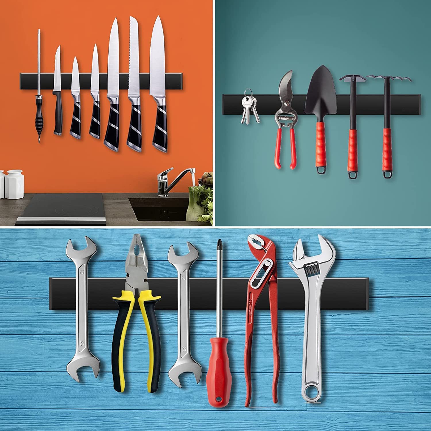 ["Multifunctional Magnetic Tool Holder: The length of this magnetic strip knife is extended to 40 cm and can accommodate more tools than most tool holders on the market. We have added two strong magnetic hooks that can save more space. Storage strip for storing knives, scissors, tools, kids toys, keys, and any versatile organizer you can imagine.","Strong Magnets: The extra strong magnet securely holds even your large and heavy knives on the non-slip surface, with a load capacity of up to 5 KG. The strong magnet keeps children away from sharp knives and the magnetic knife holder keeps the knife firmly on the wall without slipping, making your kitchen safer.","2 Easy Installation Methods: Magnetic knife holder comes with strong adhesive tape (3M adhesive) that can adhere directly to the wall. Knife holder also comes with nails, can drill hole installation according to your requirements. This magnetic knife holder includes all the accessories you need to assemble the magnetic knife strip and organize your kitchen immediately.","Modern Design: The wall-mounted magnetic strip knife is made of high-quality stainless steel, with a smooth surface that is not easy to rust and has a long service life. Magnetic blade made of stainless steel, elegant black coating, suitable for various kitchens, offices, and workshops.","Notes: The strong adhesive tape is suitable for most smooth surfaces, oil-free walls. (Strong adhesive tape is not suitable for painted walls, wallpaper, plaster walls). If you have any questions about our magnetic knife holder, please feel free to contact us, and we will provide you with a satisfactory solution.","The Best Service: We have always maintained the principle of customer first. If you have any dissatisfaction with the product, please contact us and we will provide a 12-month return service.","Please note: Self-adhesive strong tape is not applicable to painted walls, wallpaper, and plastered walls."]