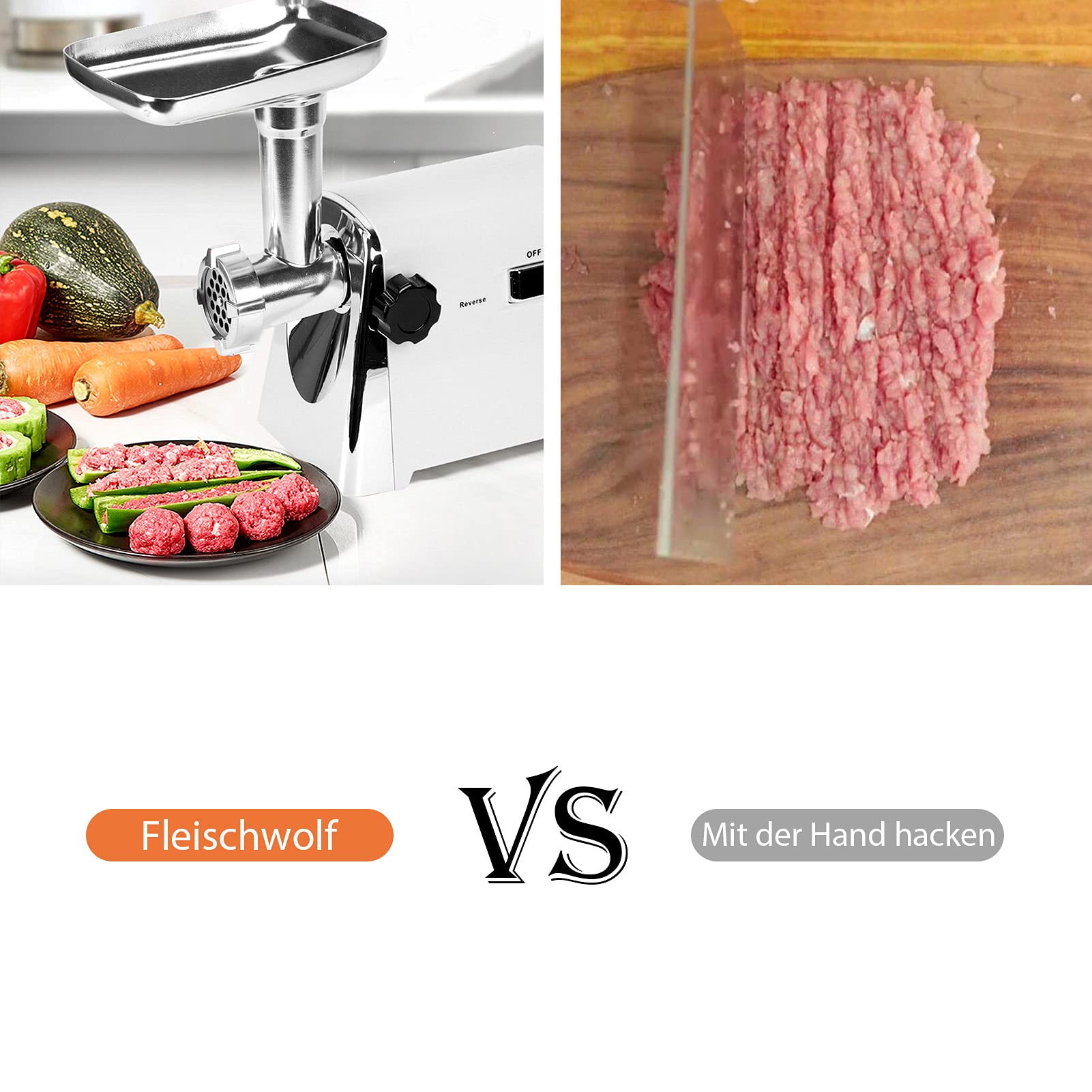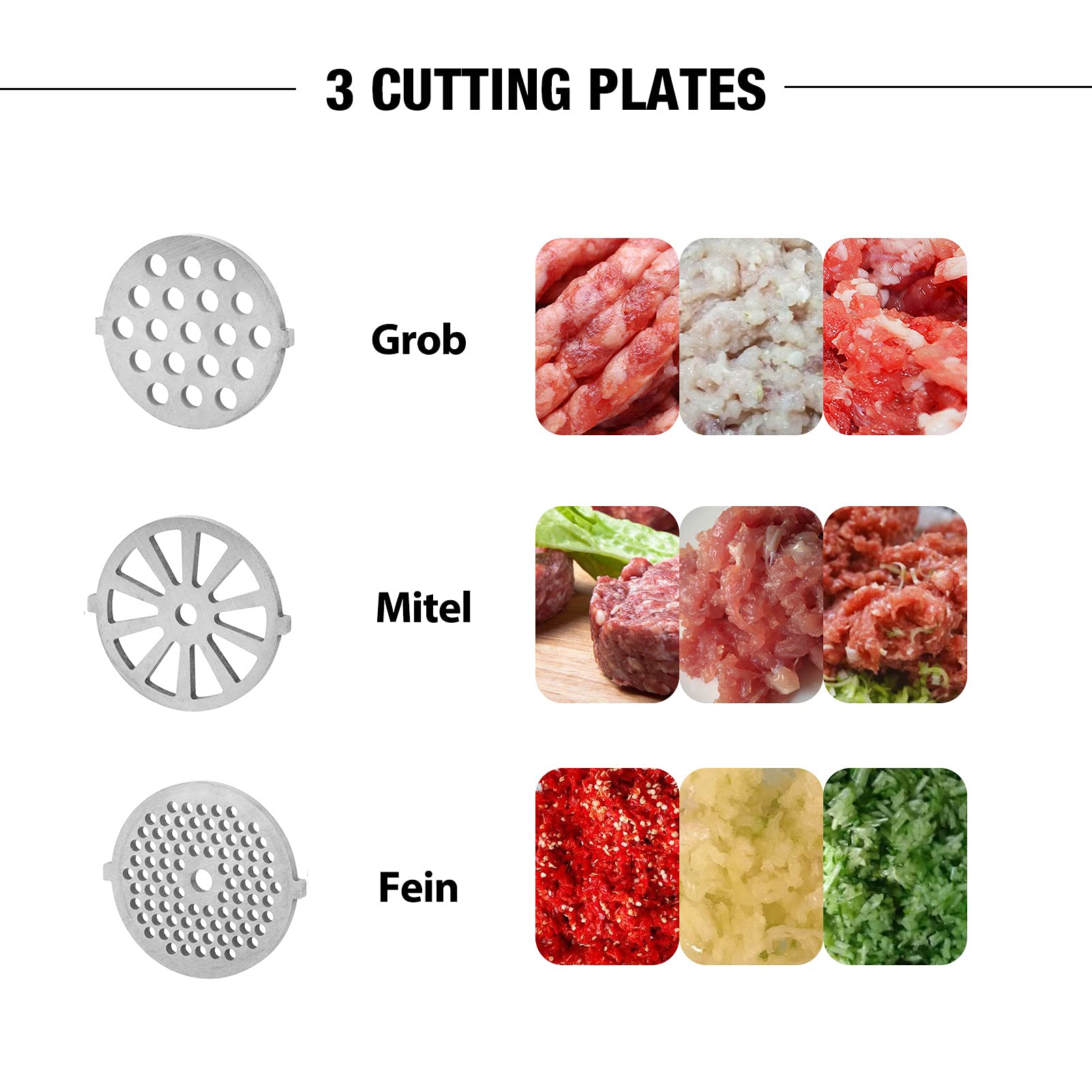 Various Sizes: 2800 Watt meat grinder with 3 grinding plates, coarse, medium, and fine, depending on whether you want a delicious sauce, finely chopped sausages, or roughly chopped roasts.