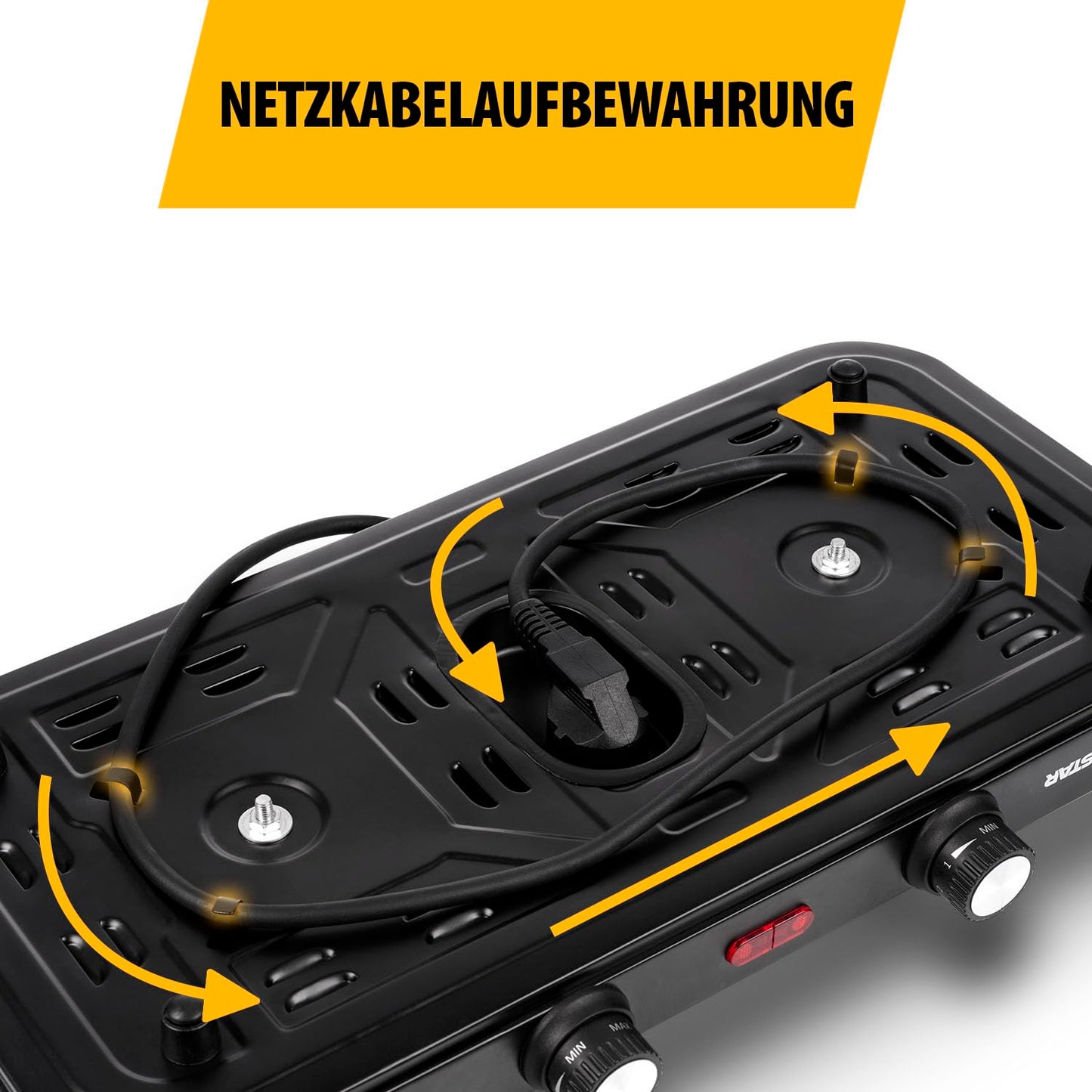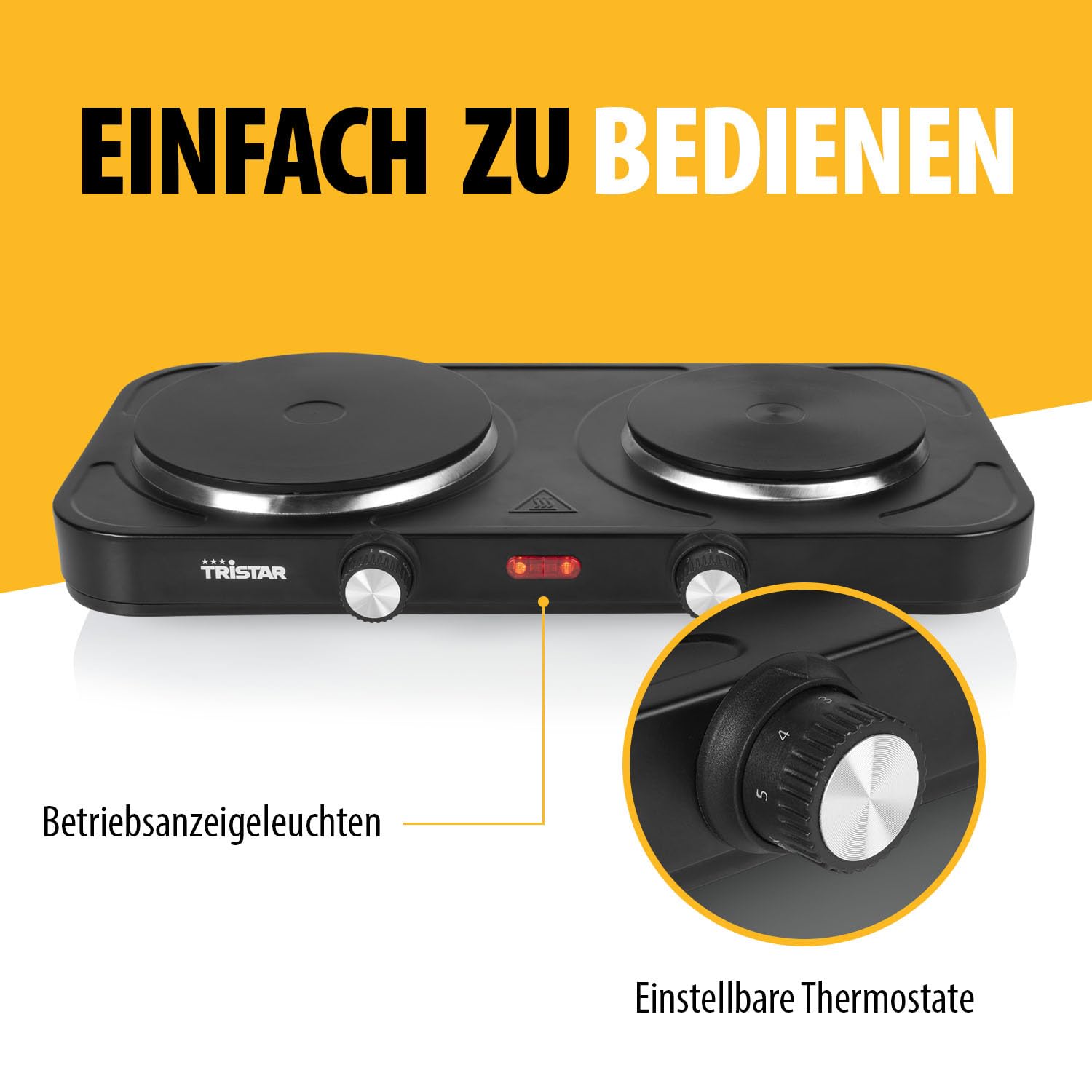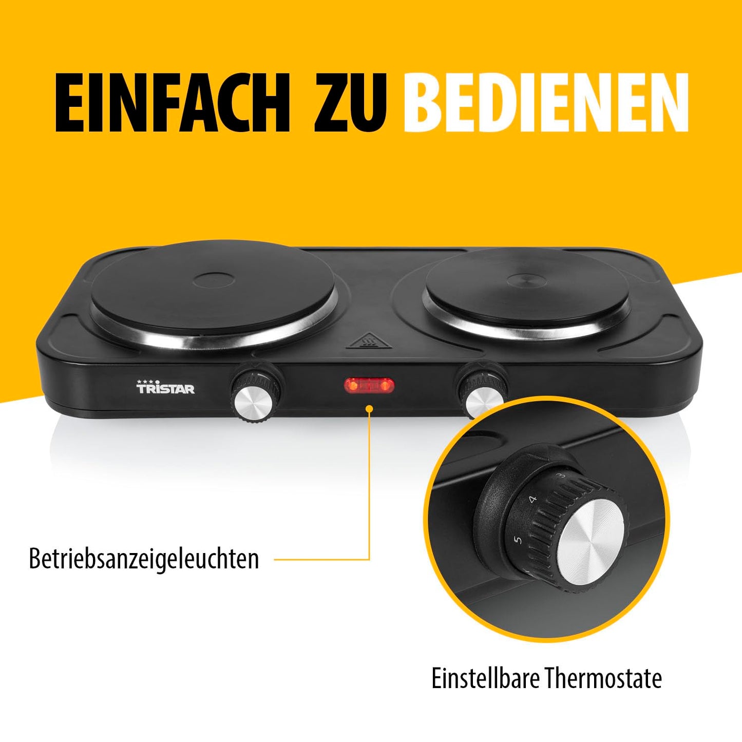 ["Double Burner: This double burner hot plate is ideal for small kitchens, dorm rooms, or as an extra cooking surface. With burners measuring 15.5 and 18.5 cm in diameter, it is suitable for both small and large pots.","Adjustable Thermostats: With the 2 knobs, you can adjust the cooking temperature of each plate individually to your liking and needs. Turn the left knob to maximum for boiling water or turn the right knob down for a simmering side dish.","Fast: With a power of 2,500 W (1,000 or 1,500 W depending on the heat level), this electric hot plate quickly reaches the desired temperature.","Safe to Use: The housing is heat-resistant, so it won't burn even if you move the plate shortly after use.","Stable: The non-slip feet ensure a secure grip on the countertop. It is less likely to tip over."]