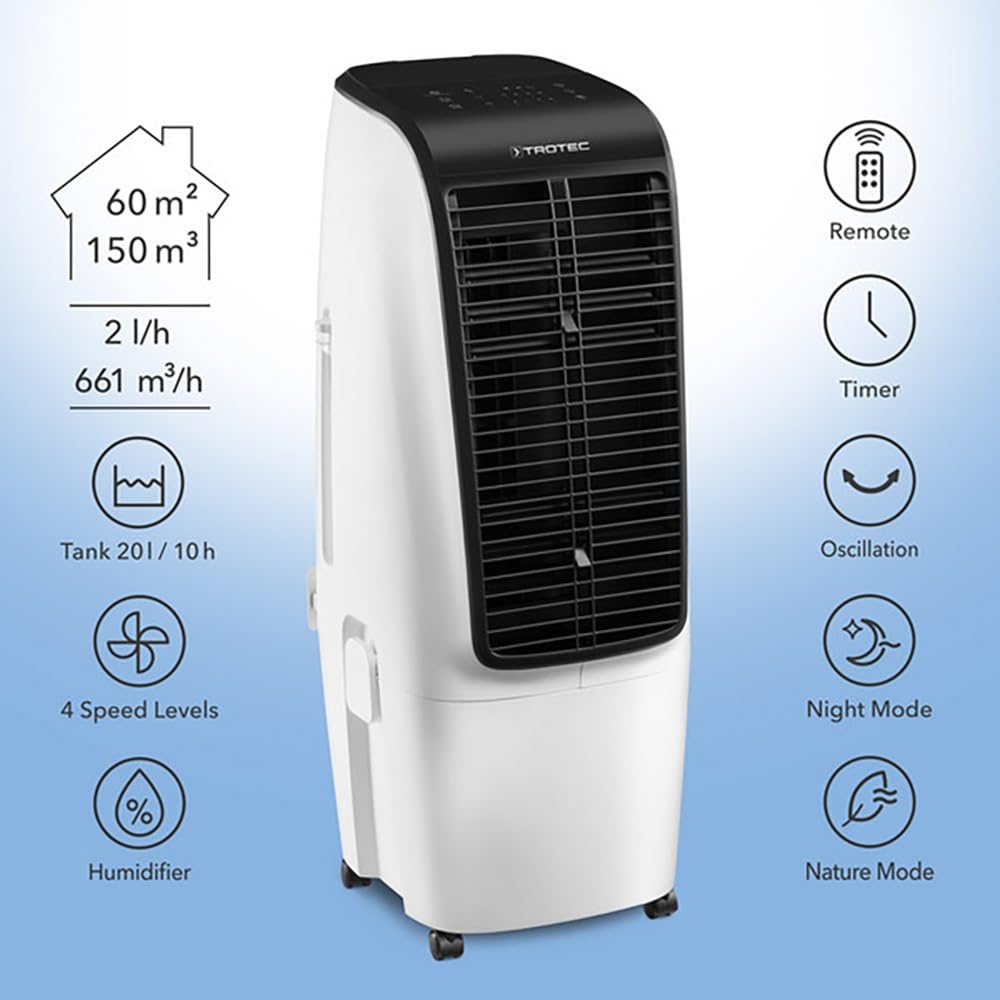 TROTEC Aircooler PAE 51 mobile air cooler, 4-in-1 air cooler, humidifier, air purifier, and fan, 20 l tank, 2 l/h evaporative capacity, 4 fan speeds, timer, night mode.