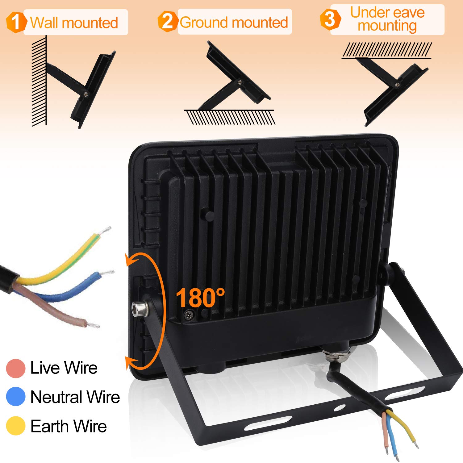 "â¨ăLarge Illumination Area & Flexible Installationă The beam angle of the LED floodlight is 120°, shadow-free and flicker-free, it can illuminate a wide area. With a widened and thickened adjustable metal bracket, the LED floodlight can be installed at various angles on ceilings and walls. The lamp body can be adjusted by 180°.