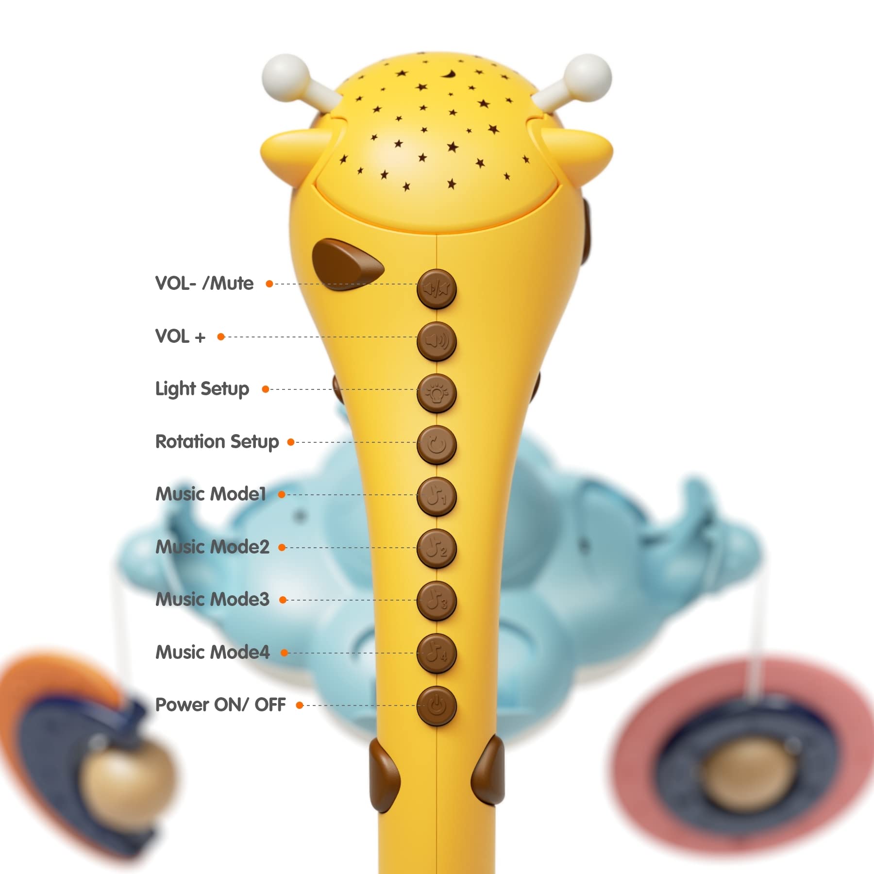 "Music, White Noise, Star Projector 3-In-1: 12 Soothing Sleep Songs And 12 White Noise, Volume Control Via Phone Or Remote. 4-Color Projection Lights, Night Light Projects Starry Ceiling Or Wall, Bringing Comfort And Magical Starry Scene For Baby","Nuts Mobile With Remote Control: Cute Zebra Mobile With Unique, Parent-Friendly Mushroom-Shaped Remote Control, Allowing You To Increase/Decrease Volume, Music, Light, Or Motor On/Off, Either Quietly Or In A Specific Baby-Friendly Way","Support Baby's Development: Various Bright Colors, Shapes, And Sounds Stimulate Your Baby's Senses. The Mobile Also Helps Your Baby Focus And Stay Calm. It Is An Ideal Gift For Newborns Who Have Been Restless At Night","Fits Most Cribs And Easy Assembly: The Crib Mobile With Adjustable Arm Easily Attaches To Any Crib With Caliber (Less Than 3.8 cm). Unique Design With 2 Fixable Directions And Adjustable, Bendable Hose Neck, With Unique Flexible Installation (Vertical Or Horizontal). And Our Hose Neck Is Adjustable And Bendable, You Can Fix It In Any Desired Direction.","Longer Engagement: Inspired By The Children's Song Twinkle Twinkle Little Star, The Mobile Features Rattles With Star And Moon Patterns And Rubber-like Teething Rings. As Baby Grows Older, You Can Remove The Main Part And Get A Portable Lamp, Projector, Music Box, Rattle, And Teething Ring"