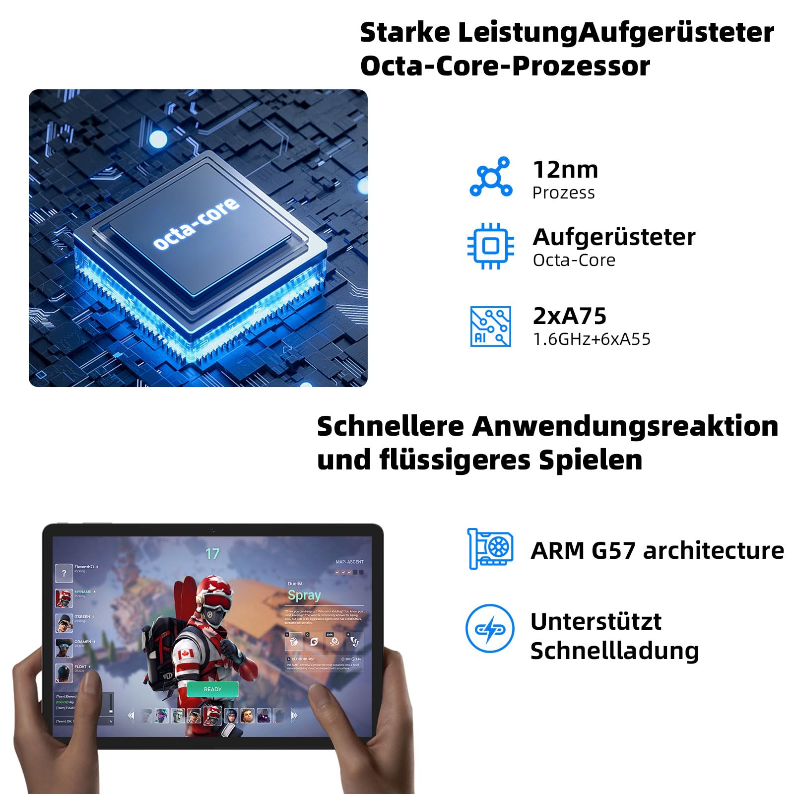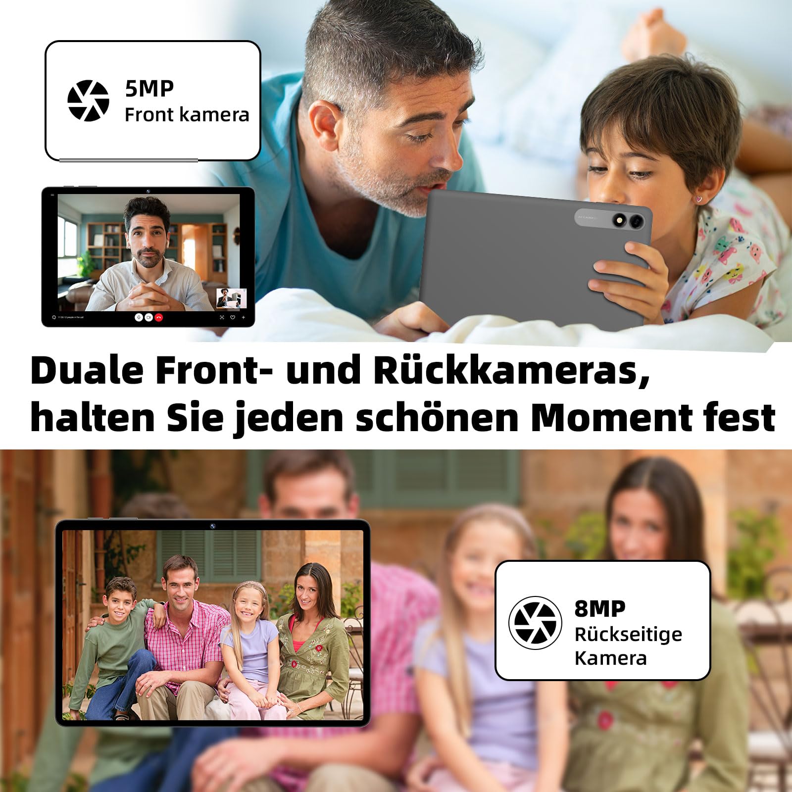 ["Android 14 + Octa-Core - The tablet is equipped with the latest Android 14 for increased privacy and security, and the most stable Octa-Core CPU processor for faster program execution and smoother internet browsing. The tablet supports split-screen multitasking, face recognition, and wireless projection for easy connection to your TV.",